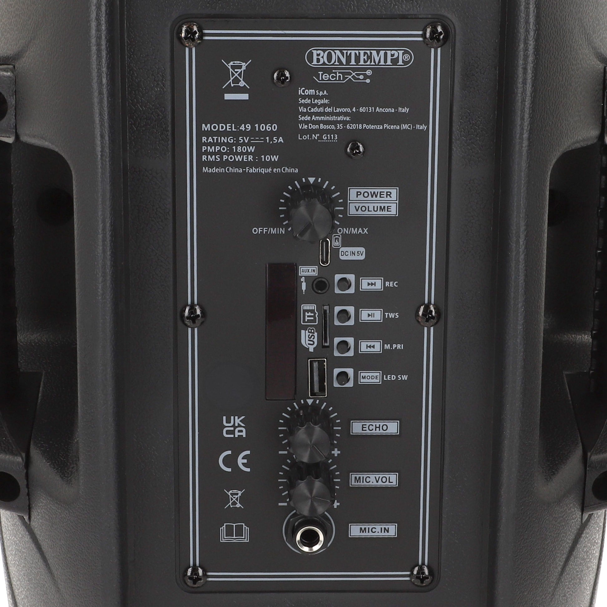 Este altavoz viene con 1 micrófono con cable incluido, luces RGB integradas que ambientan cualquier espacio, un mando que permite manejar los controles del altavoz a distancia, botones de control para volumen, graves y bajos, ecualizador, puerto USB, conectividad inalámbrica y función de radio. También incorpora batería recargable con carga por USB y la posibilidad de sincronizarlo con otro altavoz Bontempi del mismo modelo mediante la función TWS.