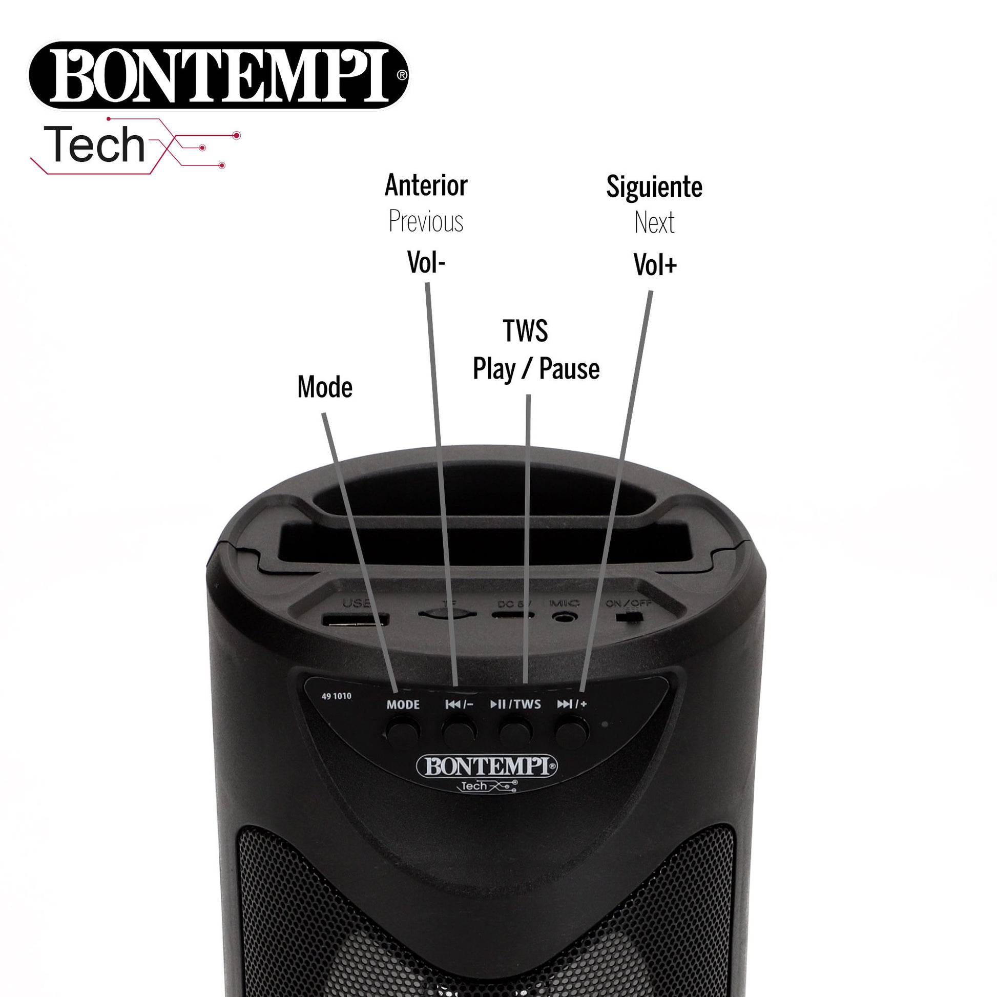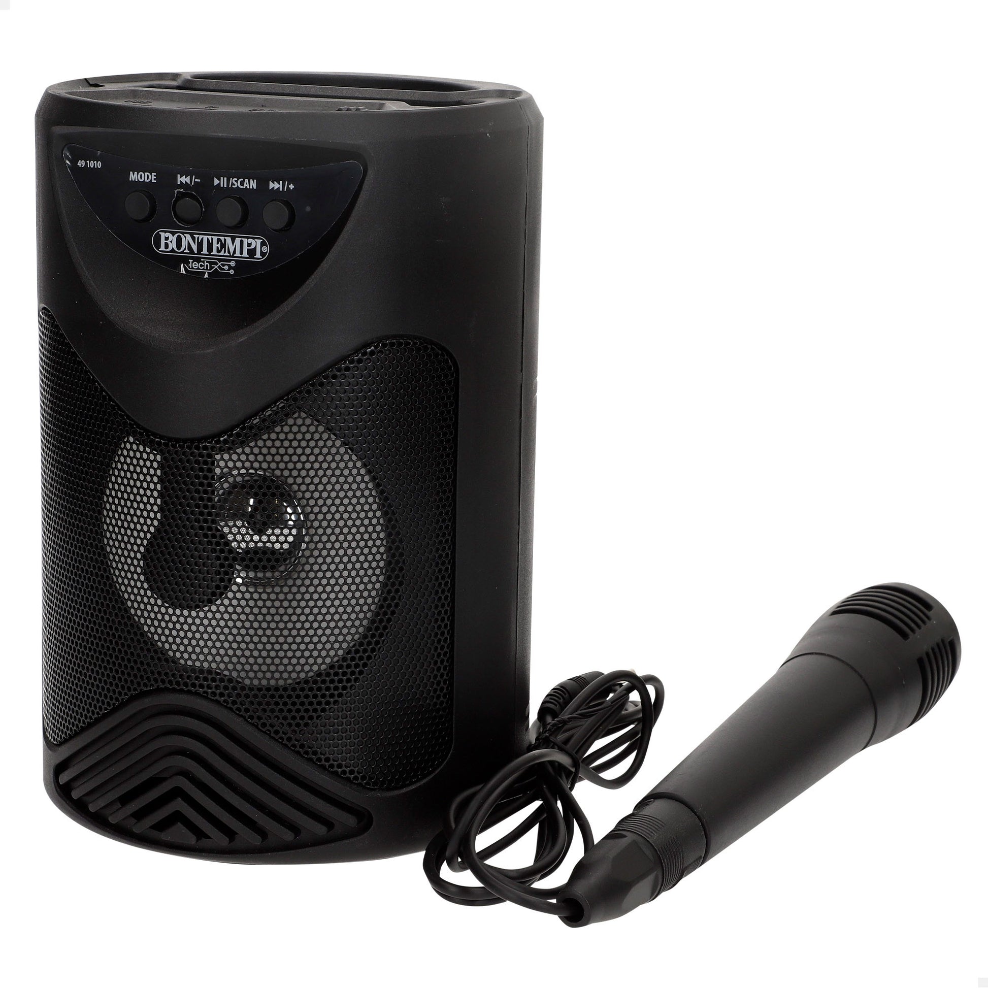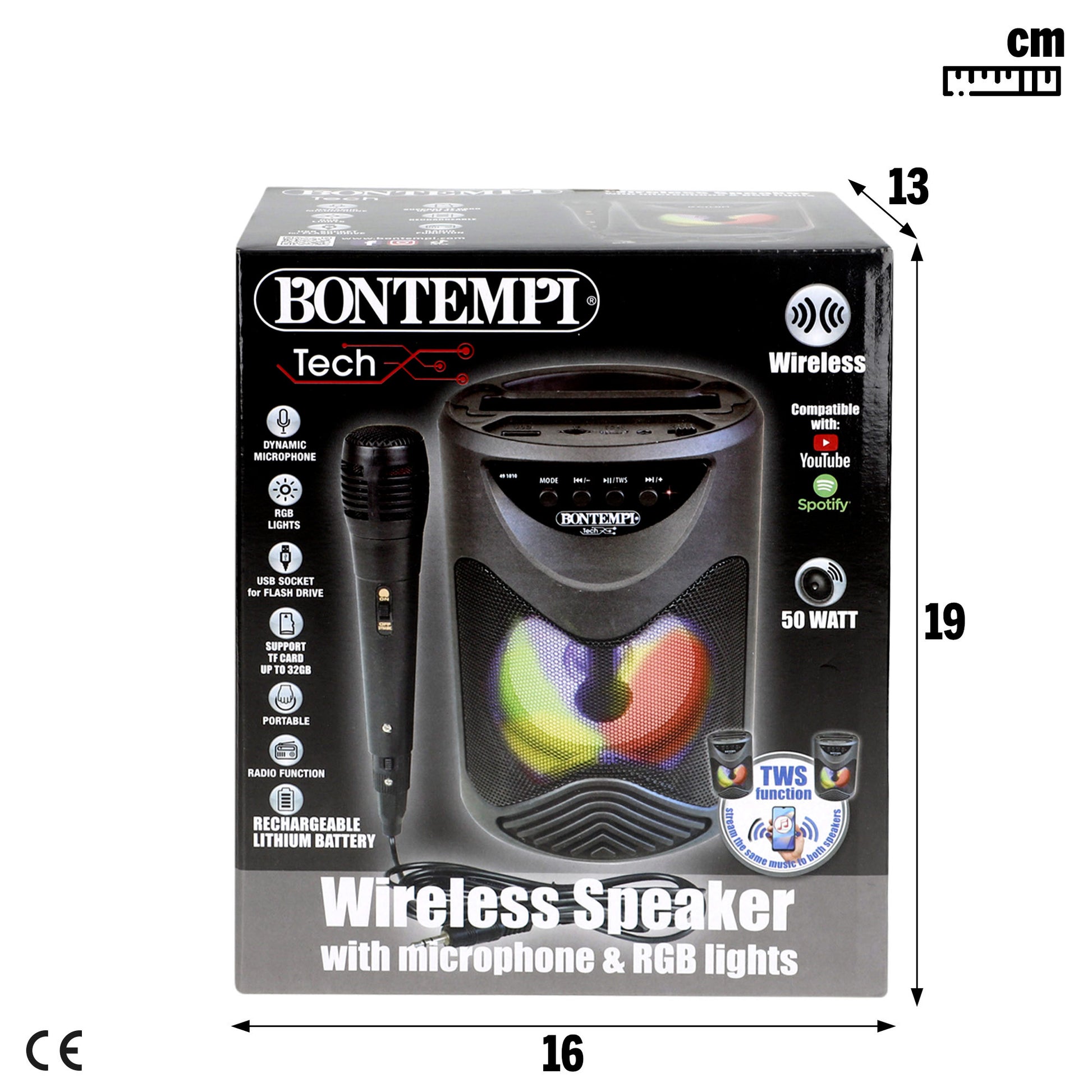 Este altavoz inalámbrico de Bontempi, con una potencia de 50W, ofrece un sonido nítido y potente, perfecto para cualquier evento, desde fiestas en casa hasta sesiones de karaoke. Con una excelente calidad de sonido y efectos de luz RGB, es perfecto tanto para montar un karaoke como para reproducir música en cualquier reunión social. Su conectividad versátil te permite enlazarlo fácilmente con tu móvil, tablet o PC de forma inalámbrica, o bien utilizar una unidad flash USB o una tarjeta microSD para escuchar tu música favorita. Además, con la función TWS, puedes conectar dos altavoces del mismo modelo para disfrutar de sonido estéreo. ¡Incluso tiene radio para sintonizar tus emisoras favoritas!