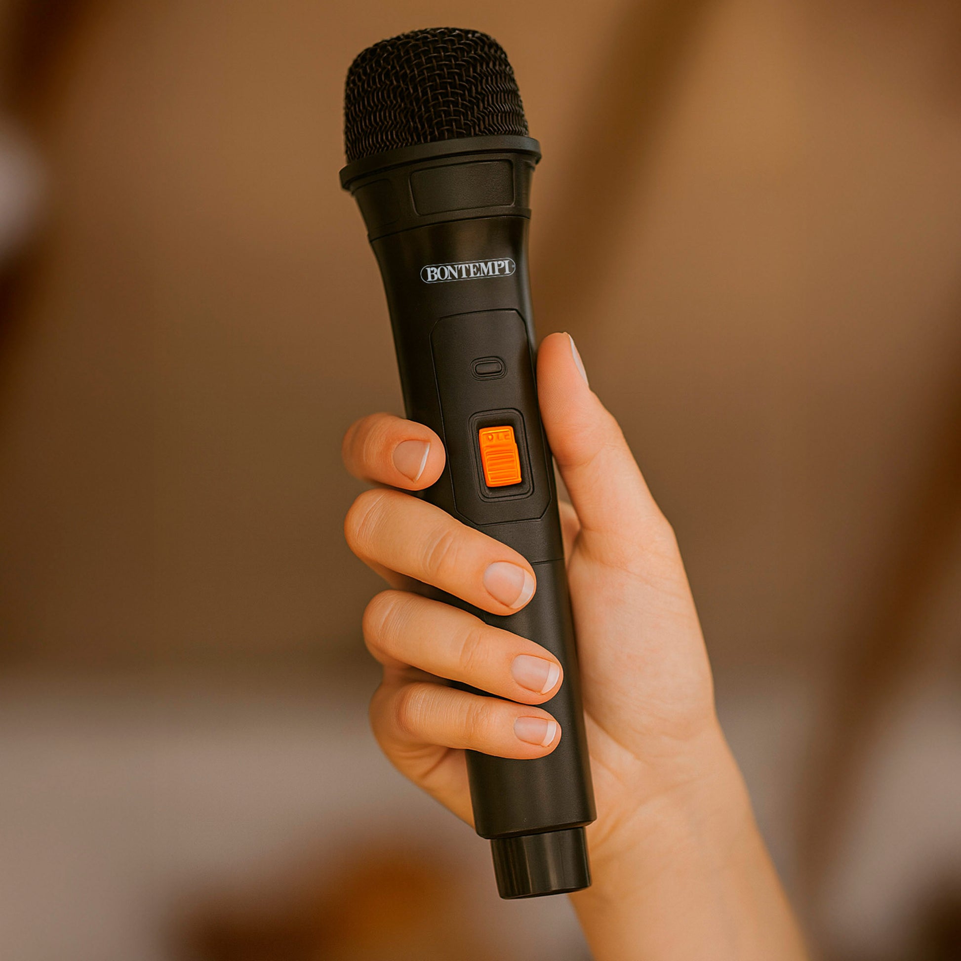 Este altavoz viene con 2 micrófonos con cable incluidos, luces RGB integradas que ambientan cualquier espacio, pantalla para mostrar las funciones activas, botones de control para volumen, graves y bajos, ecualizador, puerto USB, conectividad inalámbrica y función de radio. También incorpora batería recargable con carga por USB tipo C y la posibilidad de sincronizarlo con otro altavoz Bontempi del mismo modelo mediante la función TWS.