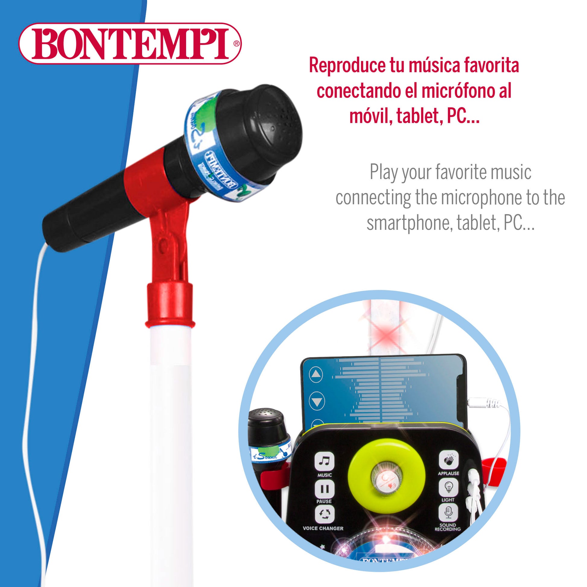 Este altavoz con micrófono infantil incorpora 6 botones táctiles que sirven para: activar las 10 piezas musicales pregrabadas, pausar y reanudar la melodía, añadir efecto de voz a través del modulador o efecto de luces y aplausos para hacerlo más realista y, también, permite seleccionar el modo de grabación para grabarte mientras cantas. También cuenta con conexión para lector MP3 (cable incluido) y con compartimento para colocar un smartphone, por lo que podrás reproducir tus canciones favoritas e incluso desconectar la voz original para ser tú el cantante. ¡Alucinante! Además, tiene un botón central que sirve para encender el altavoz o para regular el volumen de las canciones.