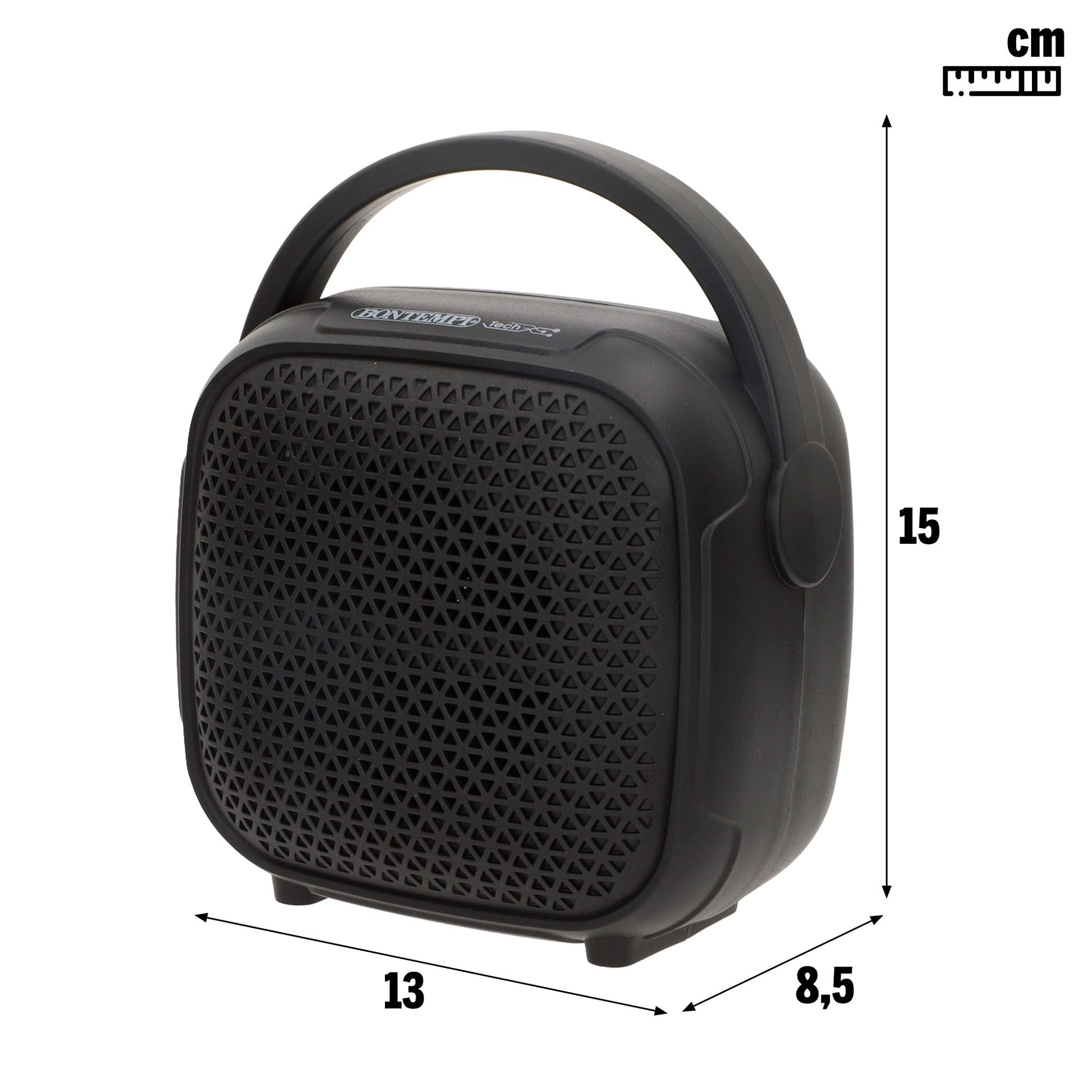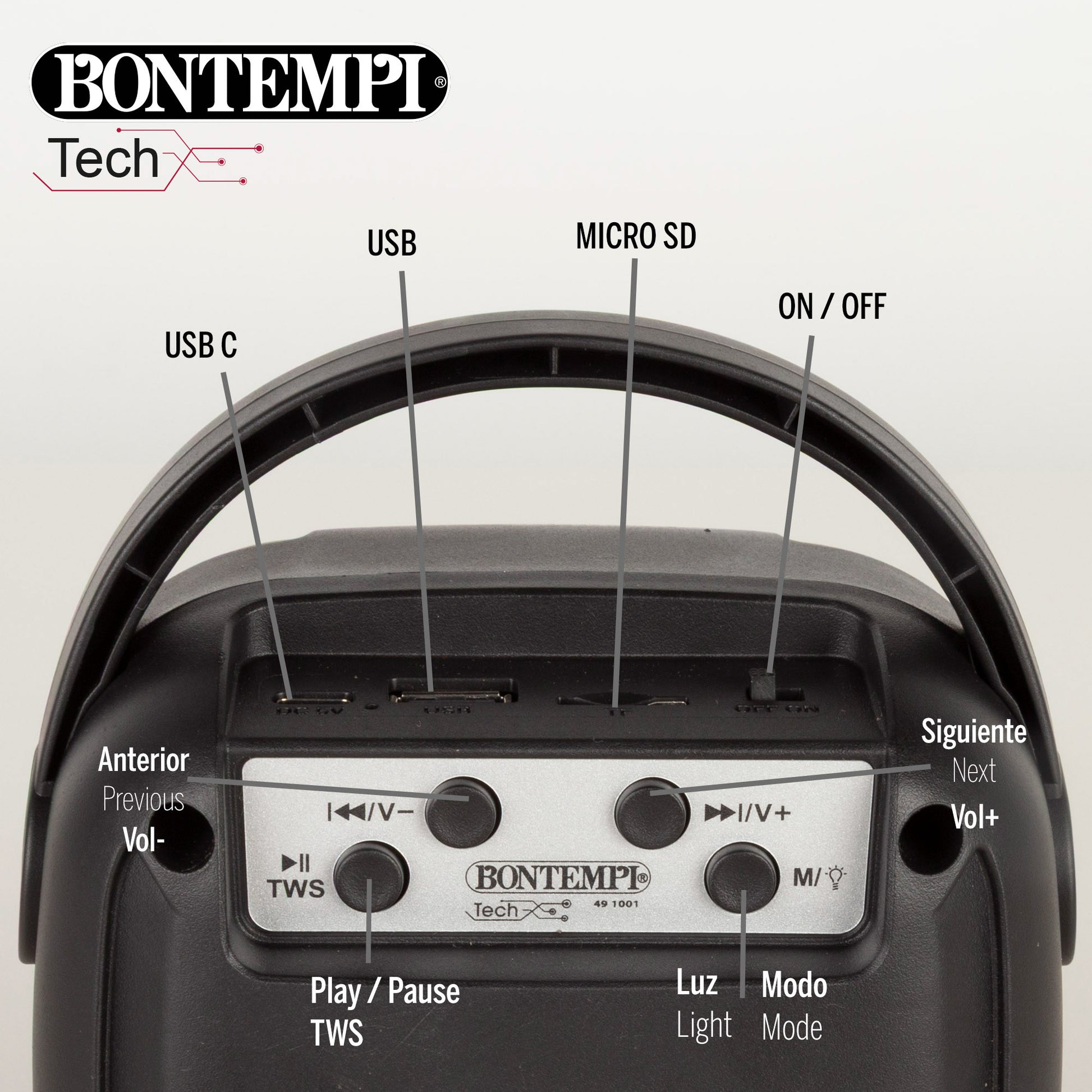 Este mini altavoz con micro es perfecto para disfrutar de la música con total libertad. Su diseño ligero con asa superior facilita llevarlo a cualquier parte, y sus luces RGB crean un ambiente animado allá donde suene. Permite reproducir música de distintas formas: conexión inalámbrica por Bluetooth, función de radio o bien desde dispositivos externos gracias a su puerto USB, entrada auxiliar o ranura para tarjeta microSD. Además, su tecnología TWS permite conectarlo con otro altavoz del mismo modelo y obtener sonido estéreo para una experiencia más envolvente.