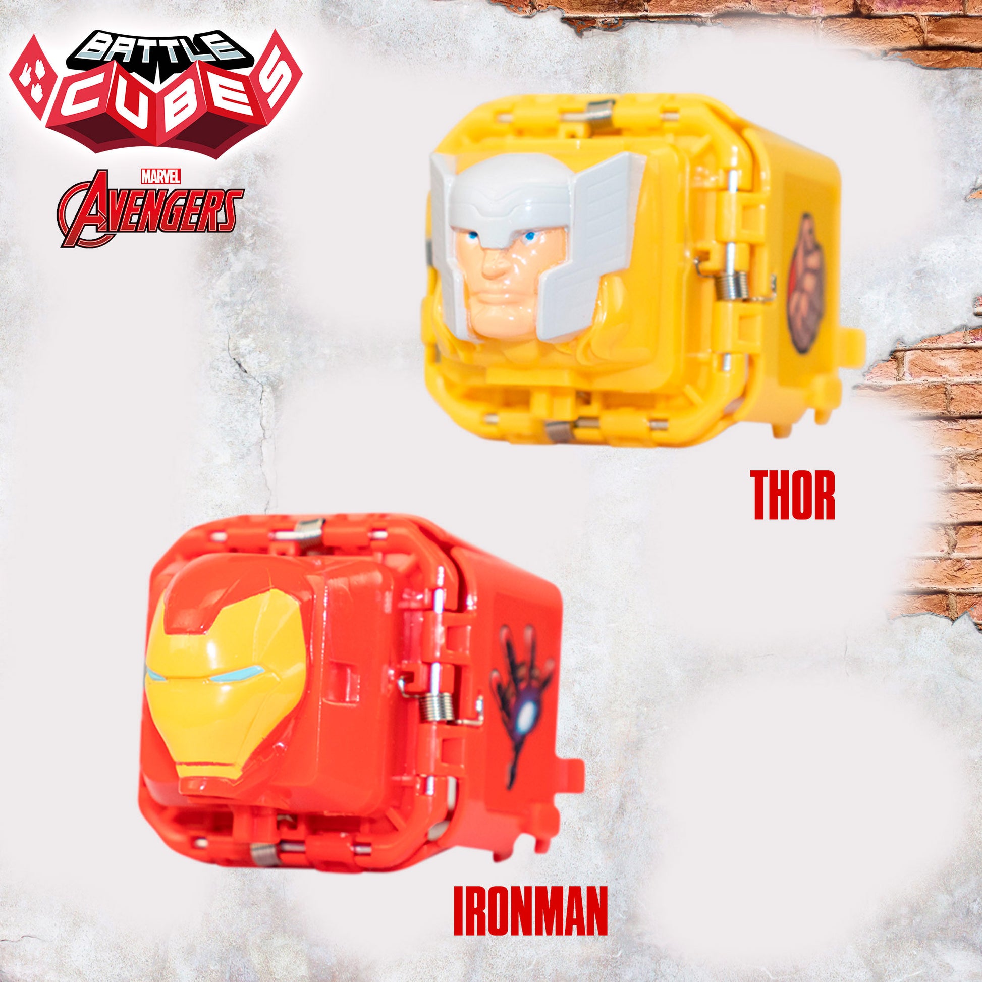 ¡Jugar con los Battle Cubes es muy sencillo y divertido! Lo primero que debes hacer es elegir a uno de los dos personajes del pack de la saga Los Vengadores: Iron Man o Thor. Después, extraer la cara del personaje y seleccionar cuidadosamente tu estrategia de ataque sin que tus contrincantes lo vean. Una vez has elegido piedra, papel o tijera, deberás abrir el cubo y cerrarlo al revés, dejando al personaje en su interior. Ahora que ya está todo listo, solo queda ir a batallar. Cada contrincante debe encarar su Battle Cube frente al del adversario y lanzar su cubo para descubrir qué cubo atrapa al otro y gana el combate.
