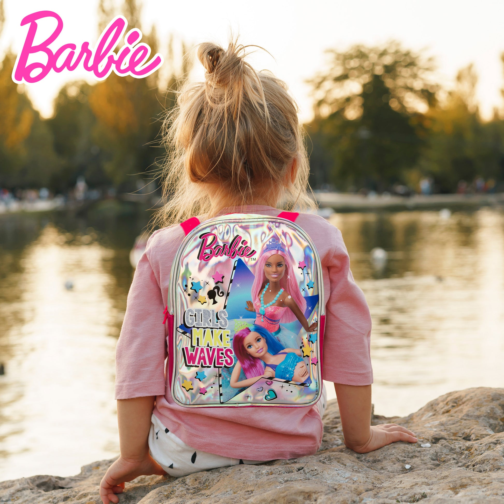 Mochila Barbie brillante con detalles iridiscentes, doble cremallera con forma de la silueta de Barbie, correas ajustables e ilustración de dos muñecas Barbie, estrellitas y texto "Girls Make Waves". En su interior hay 600 gramos de pasta para modelar de colores (azul, verde, fucsia, lila, rosa y amarillo), cuatro moldes con formas (estrella, corazón, flor y círculo), 3 herramientas para moldear y un manual creativo.