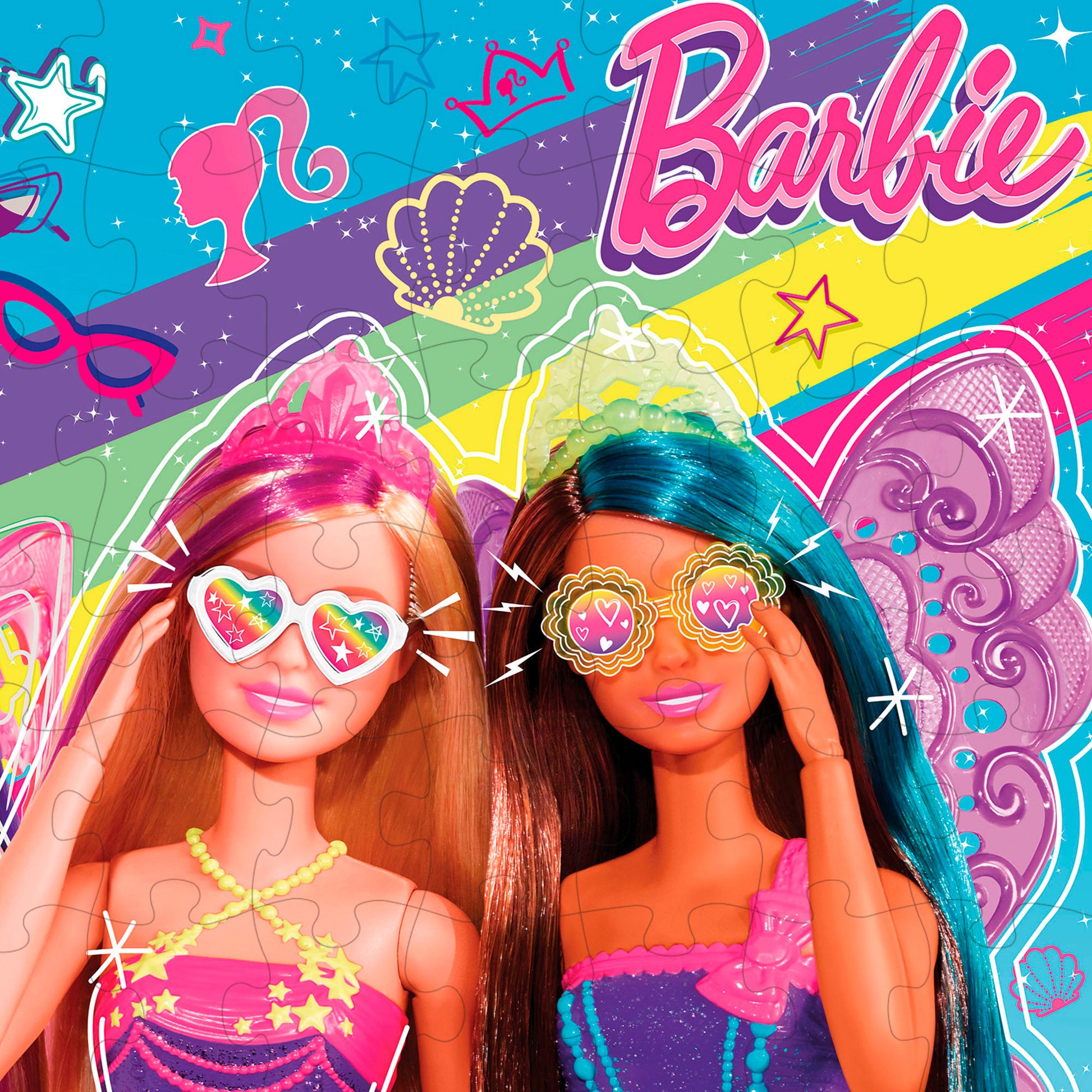 ¡Este puzzle piezas grandes es perfecto para los amantes de Barbie! Una vez montado muestra la encantadora imagen de tres muñecas Barbie con alas de hada y accesorios como coronas y gafas de sol multicoloridas, cada una con su estilo único, rodeadas de un ambiente vibrante y lleno de color.