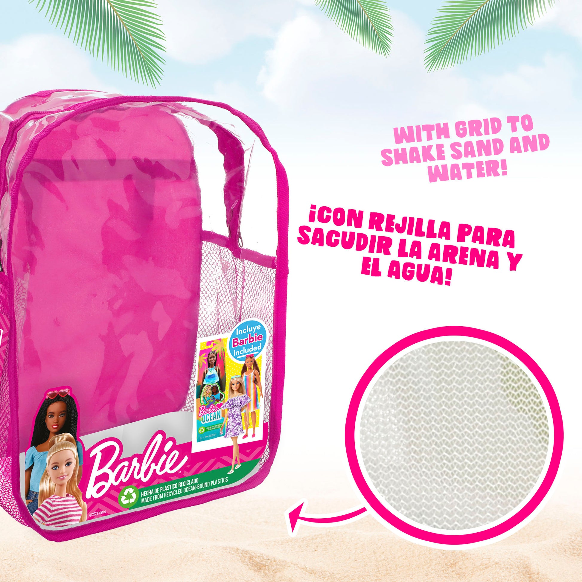 El set mochila con juguetes de playa está recomendado a partir de 18 meses. El cubo mide 18 cm de diámetro (tamaño ideal para que los pequeños puedan manejarlo de forma cómoda) y la pala y el rastrillo miden 27 cm de largo. La muñeca Barbie está fabricada con un 90% de plástico reciclado y está disponible en 3 modelos surtidos. La mochila se puede enjuagar en el agua para quitarle la arena.