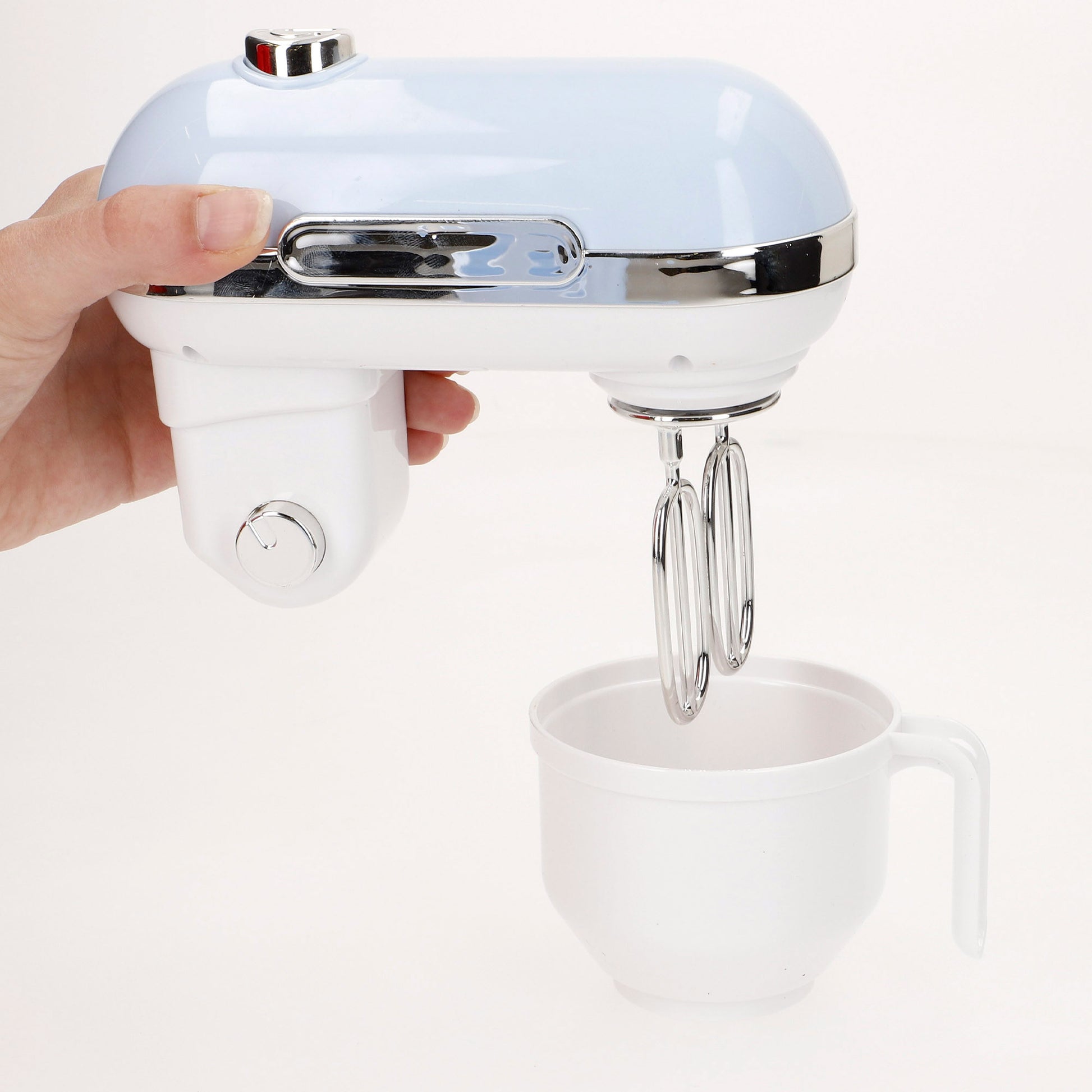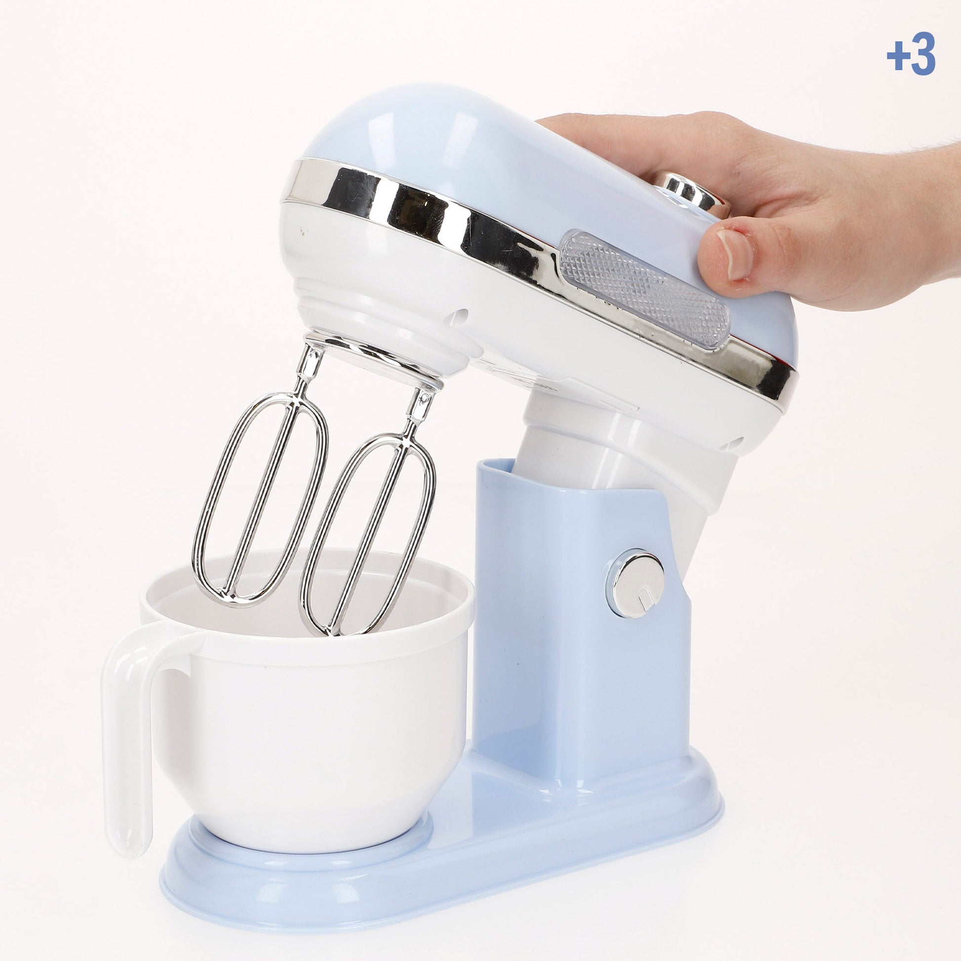 Esta batidora de juguete, en blanco y azul pastel con elegantes detalles metálicos brillantes, es ideal para pequeñas manos creativas. Su brazo es extraíble y tiene un botón de encendido que activa el giro automático de las varillas, simulando el movimiento de una batidora real. El brazo superior se levanta para facilitar la colocación o extracción del bol incluido. Con luz y sonido integrados, este juguete ofrece una experiencia de juego más auténtica y divertida.