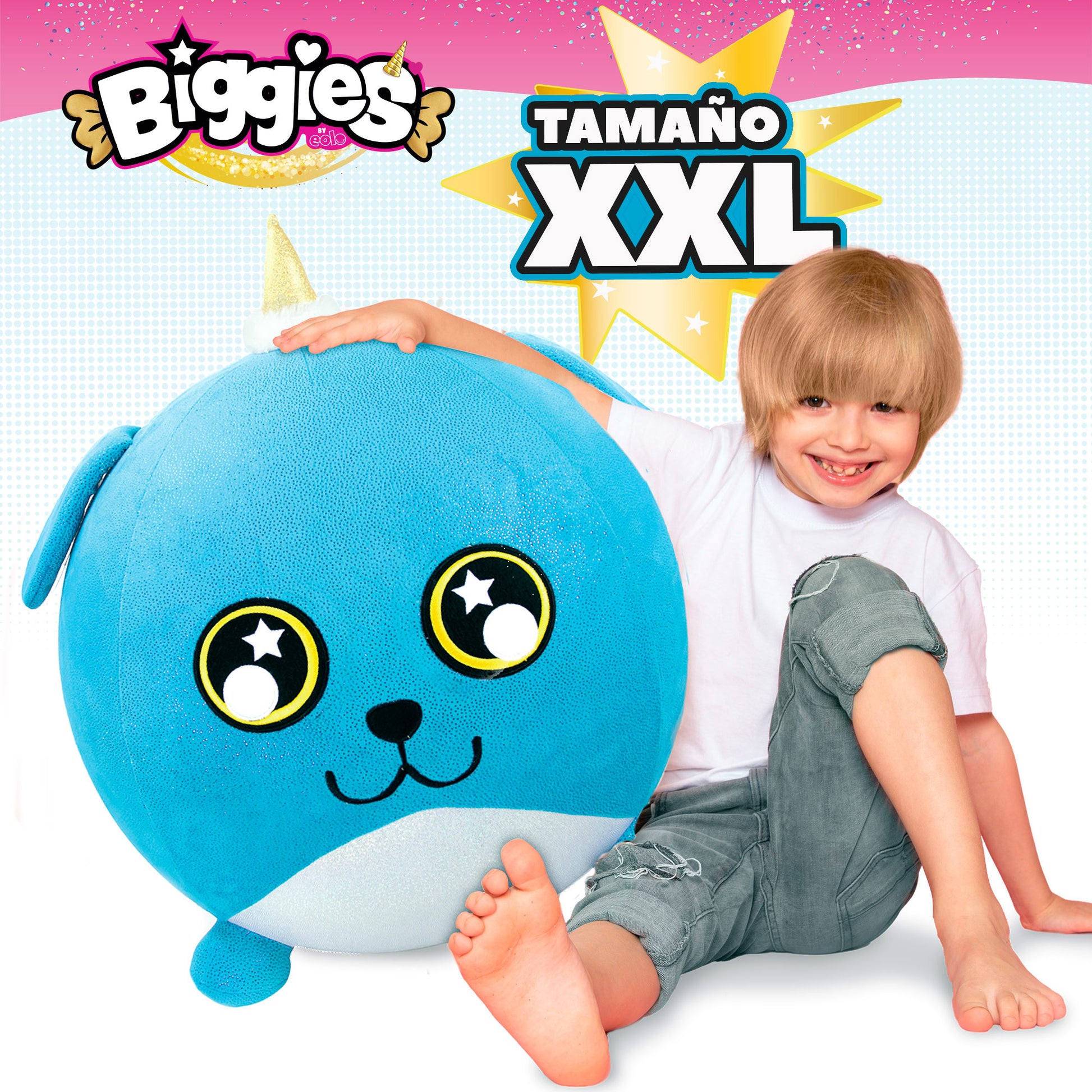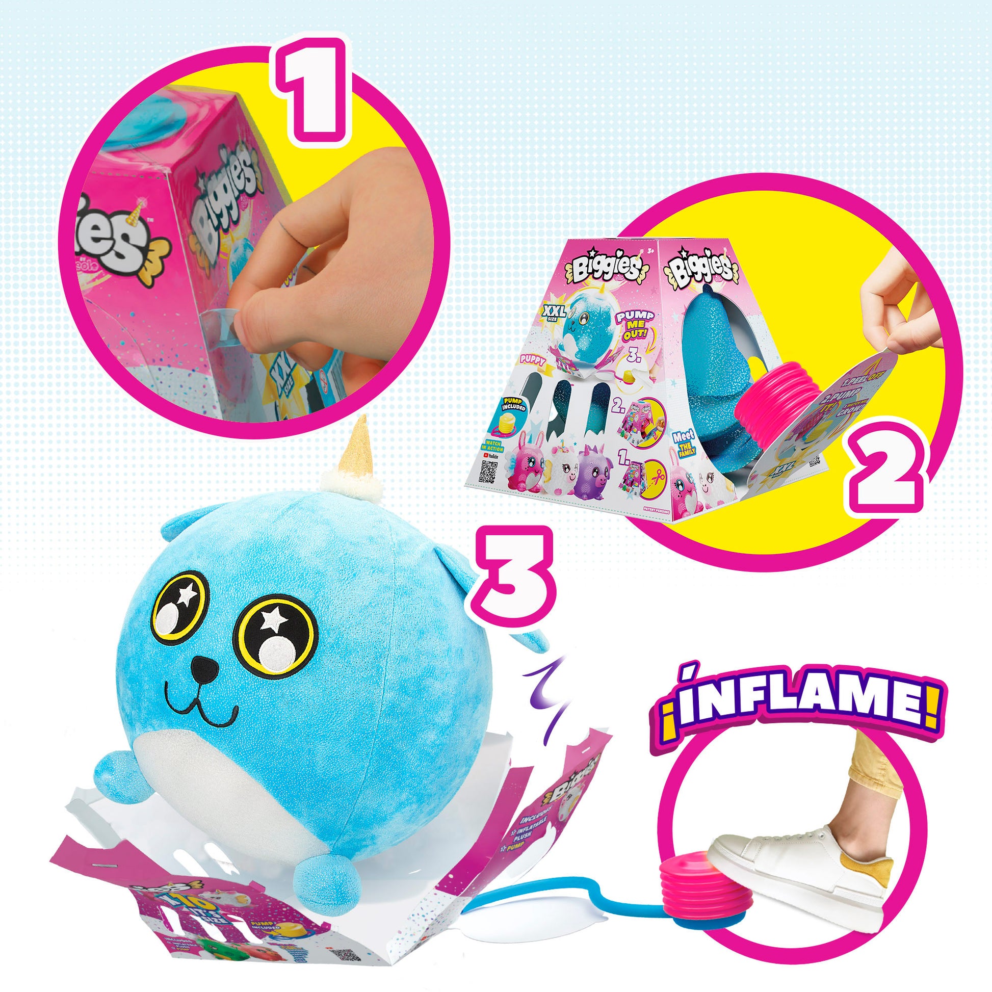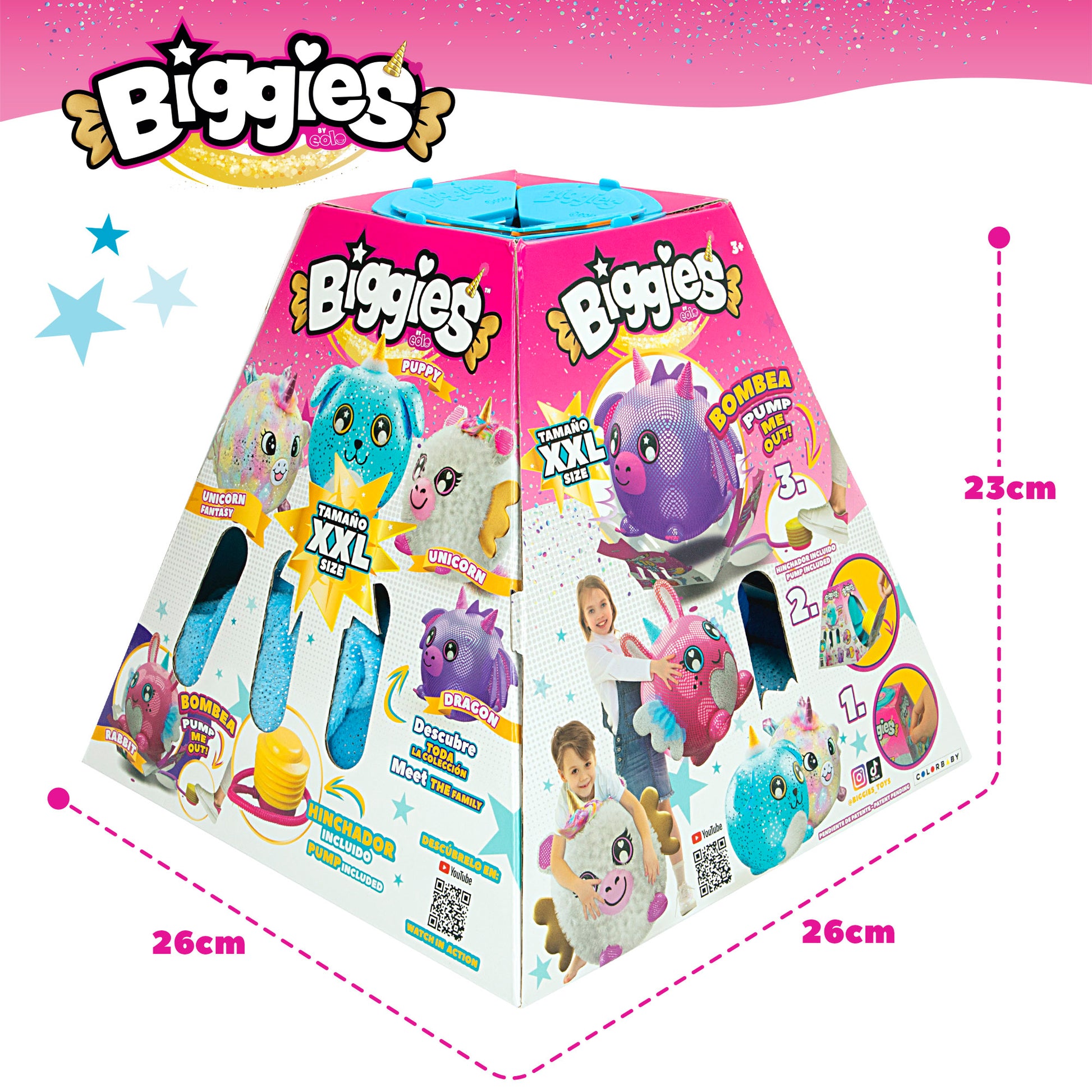 Los Biggies son unos adorables peluches hinchables que crecen sin parar hasta multiplicar su tamaño por 10 cuando los hinchas. Vienen en el interior de una caja sorpresa y hay 4 diferentes para coleccionar: unicornio, unicornio fantasía, perrito y dragón. Prepara el hinchador de pie que viene en su caja, bombea y ¡BOM! La caja se abrirá por completo y aparecerá un simpático perro de peluche XXL para sorprenderte.