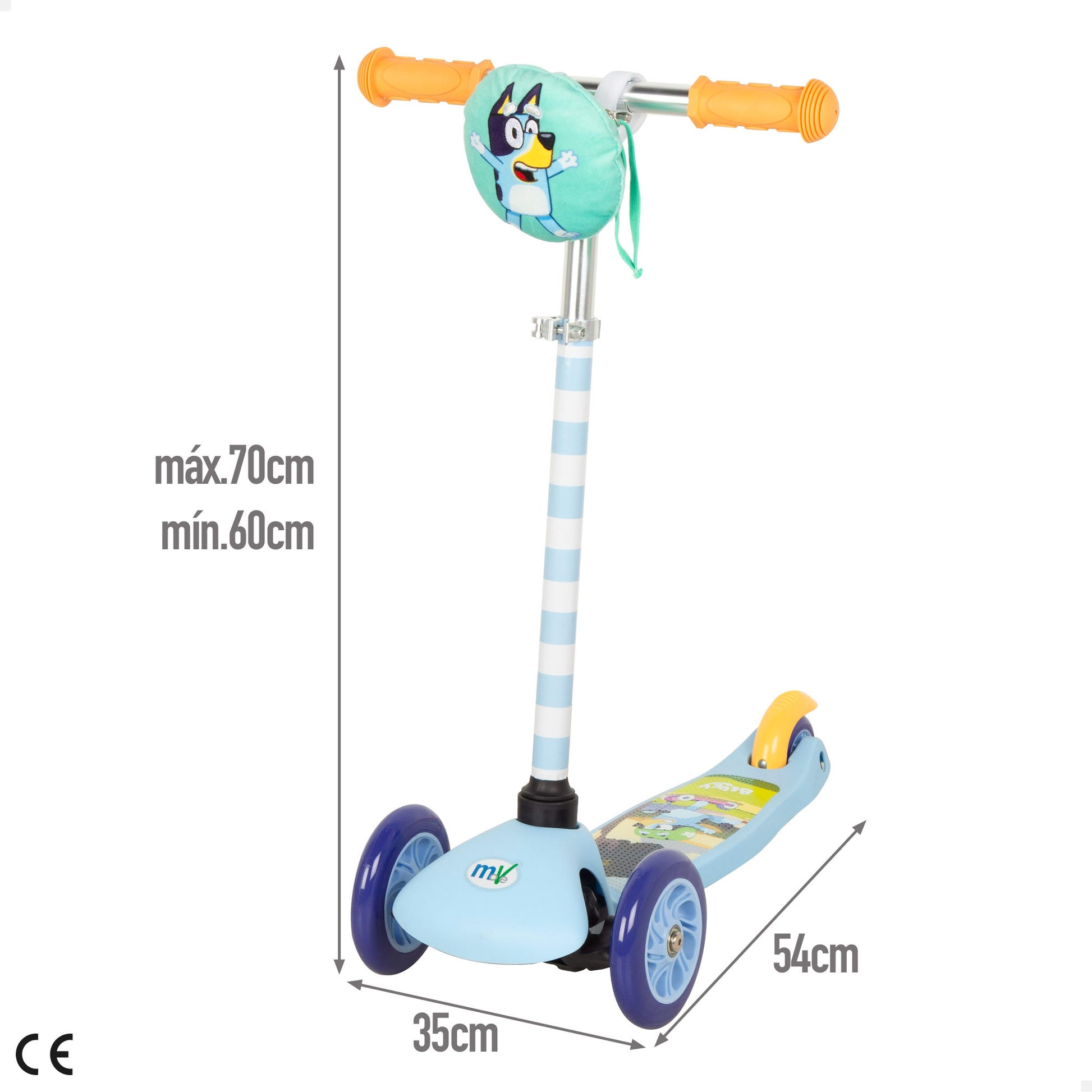 El patinete incorpora un manillar ajustable en altura con puños ergonómicos para un agarre cómodo, una bolsa delantera decorada con Bluey para guardar pequeños objetos, base antideslizante y tres ruedas que aportan una conducción más segura y estable.