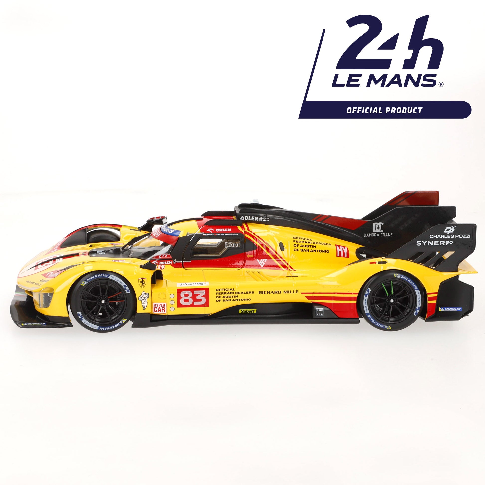 Incluye una réplica metálica del coche Ferrari 499P LMH 2024 con número 83 a escala 1:18. El modelo está fabricado con cuerpo die-cast y presenta un diseño fiel al original con acabados de gran realismo. Las puertas se abren de forma manual, lo que permite ver con más detalle el interior del vehículo. No requiere pilas.