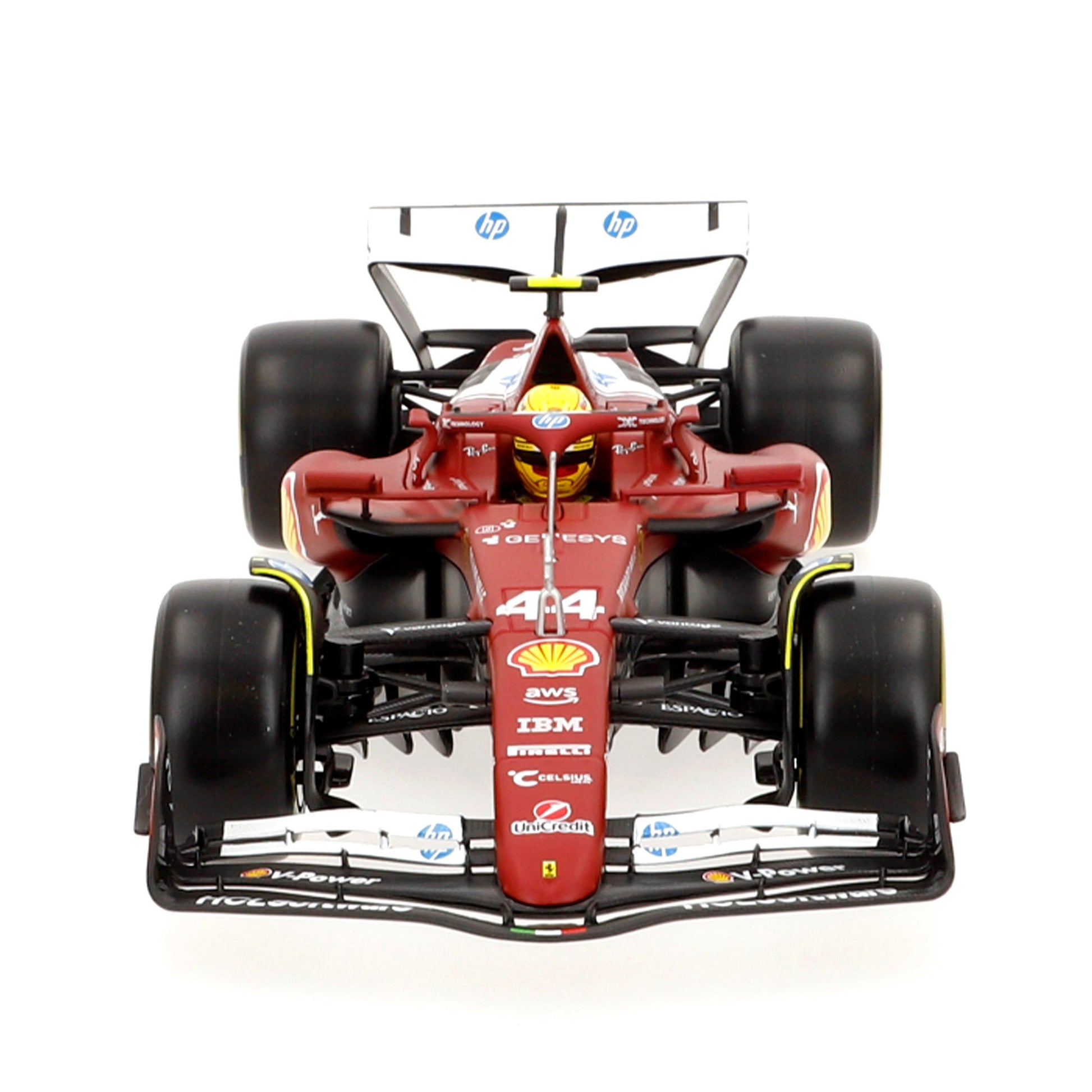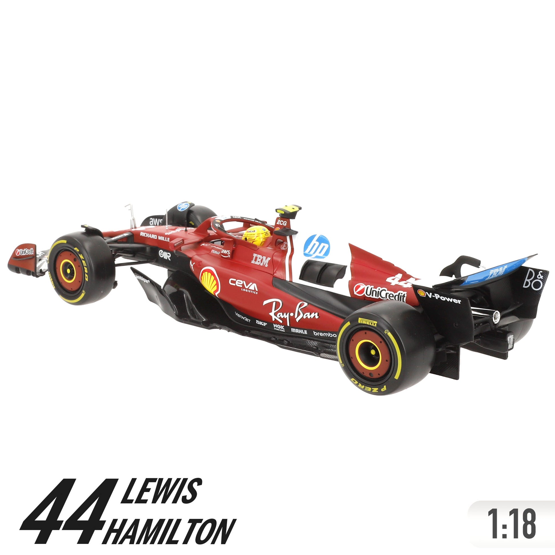 El modelo incorpora alerones detallados, sistema halo, neumáticos con el logo oficial de Pirelli y el dorsal #44 de Hamilton. Está fabricado en metal die-cast con partes en plástico de alta calidad para lograr un acabado realista y resistente. Además, incluye una base expositora con el nombre del piloto, perfecta para lucirlo en vitrinas o estanterías.