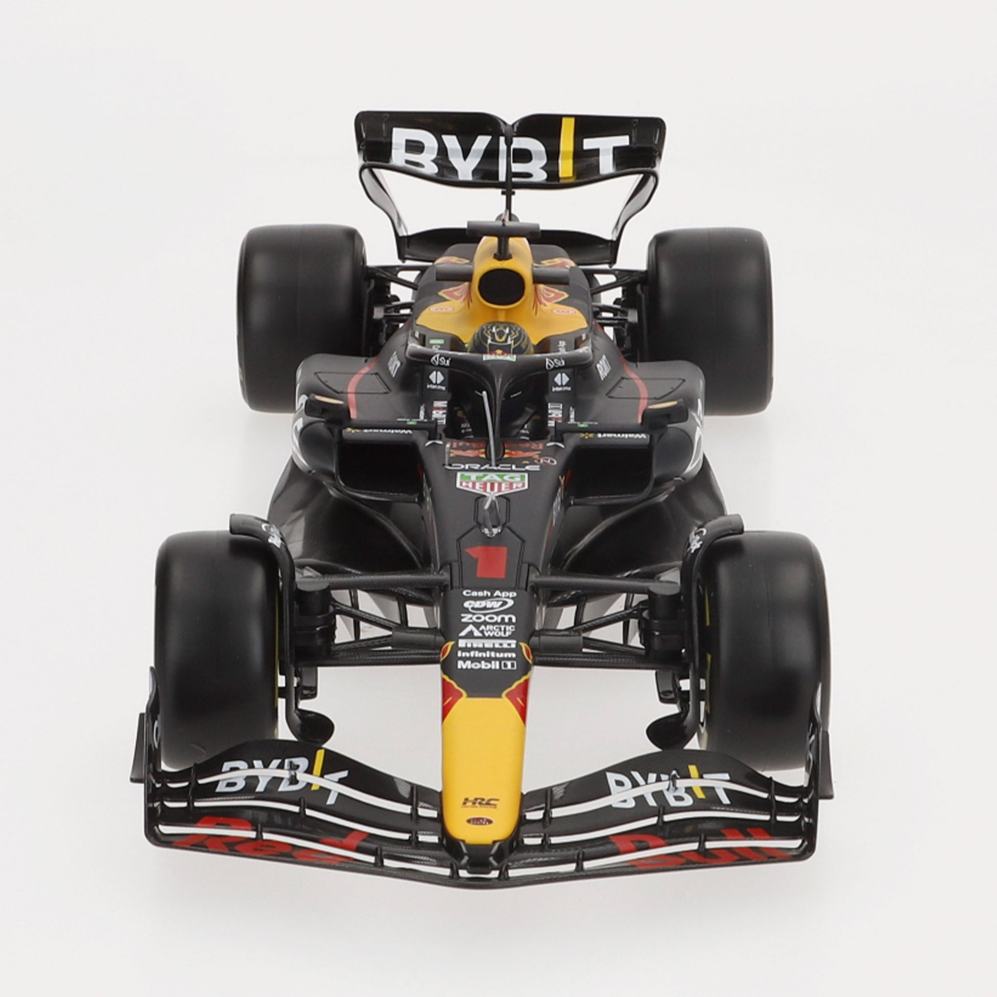 El RB19 es el monoplaza con el que Max Verstappen llevó a Red Bull Racing a lo más alto en 2023, consolidando su dominio en el campeonato. Su diseño aerodinámico vanguardista y su característico acabado en negro mate con detalles en rojo y amarillo reflejan la identidad de la escudería. Este modelo incluye los logotipos de sus patrocinadores oficiales, como Oracle, Red Bull, Mobil 1 y Bybit, reproducidos con máxima fidelidad.
