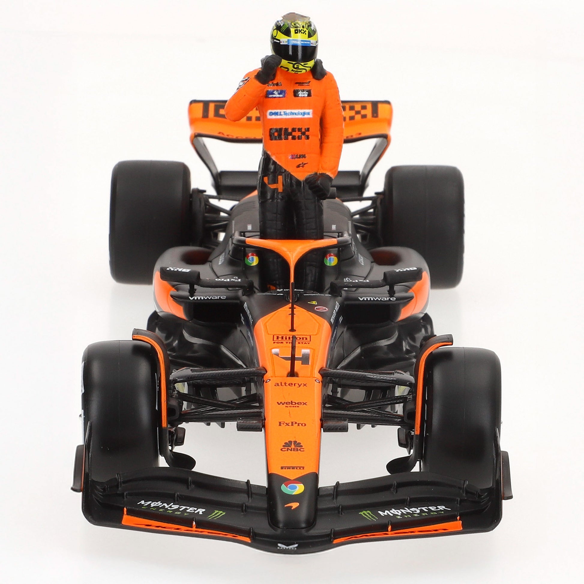 Esta espectacular maqueta a escala 1:24 reproduce con gran fidelidad el McLaren MCL38 pilotado por Lando Norris en el Gran Premio de Miami 2024. Esta pieza destaca por su diseño realista, con acabados de alta calidad, colores característicos del equipo McLaren, y todos los patrocinadores oficiales del coche de competición. Incluye además una figura estática de Lando Norris con mono de carrera, ideal para completar la escena. Una pieza imprescindible para coleccionistas y fans del piloto británico.