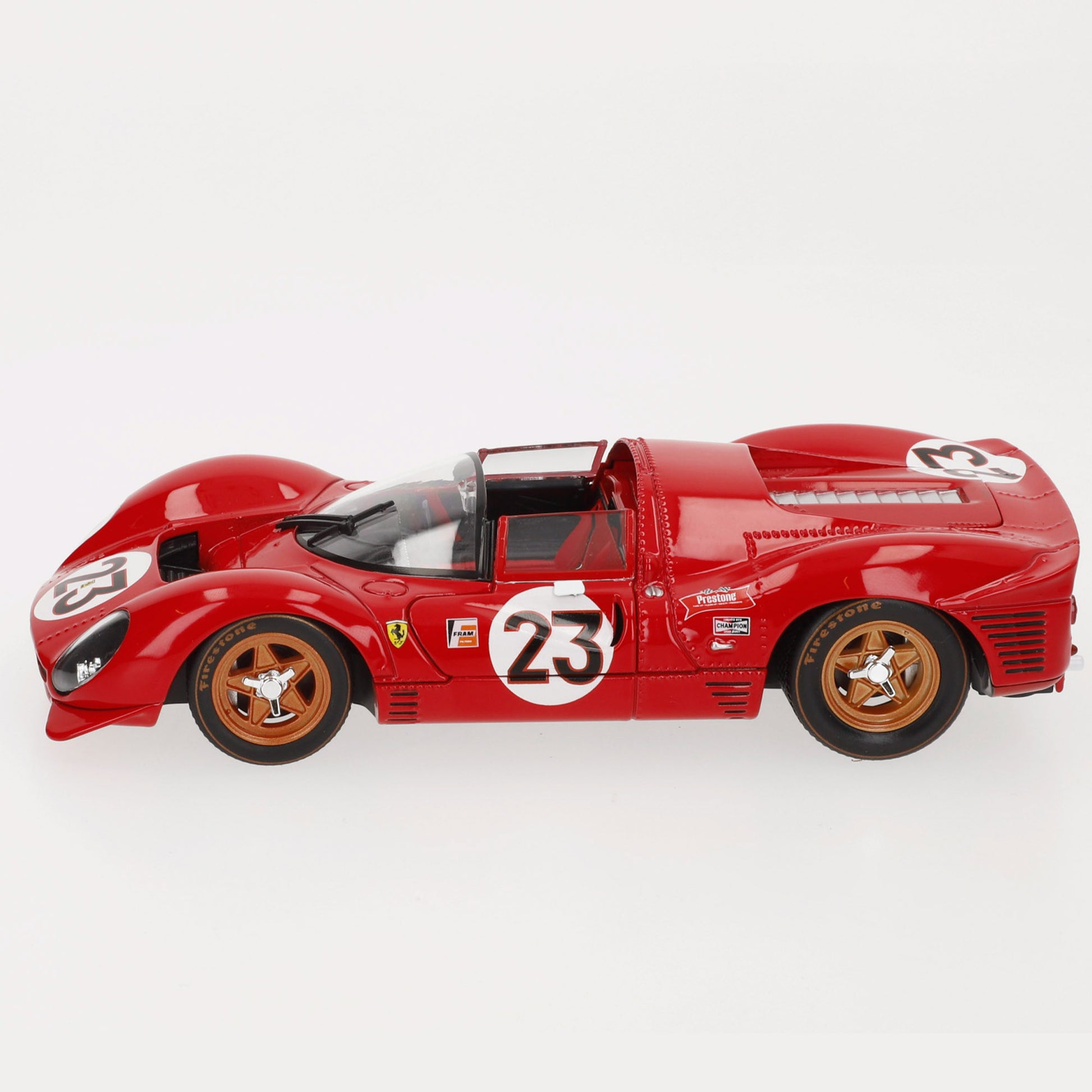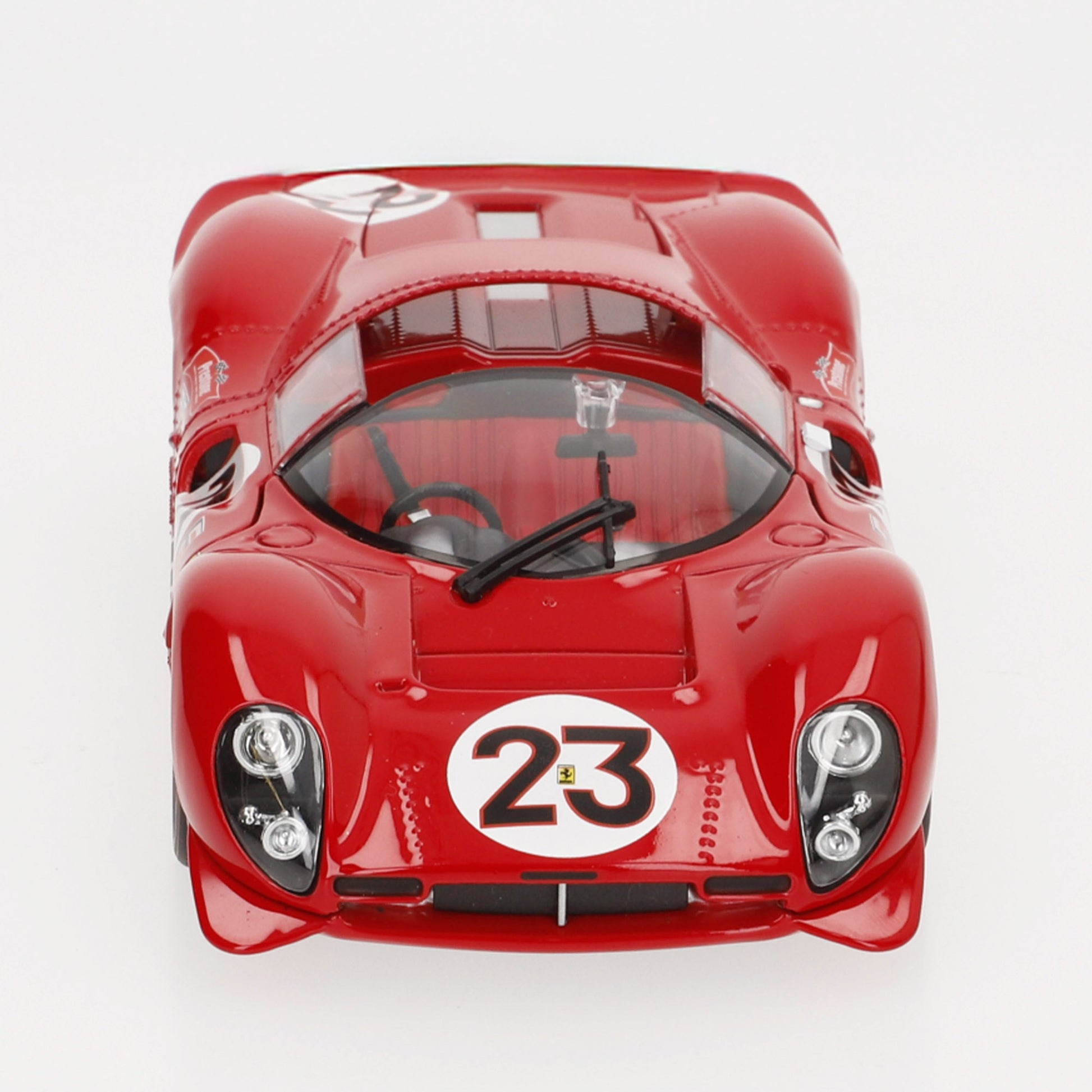 El Ferrari 330 P4 es uno de los coches de competición más icónicos de la historia del automovilismo. Su victoria en las 24 Horas de Daytona de 1967, logrando un memorable 1-2-3 para Ferrari, consolidó su estatus como un referente en las carreras de resistencia. Esta maqueta a escala 1:24 de Burago recrea con precisión su diseño aerodinámico y su característico acabado en Rosso Corsa con el dorsal #23, representando fielmente la versión que dominó la mítica carrera.