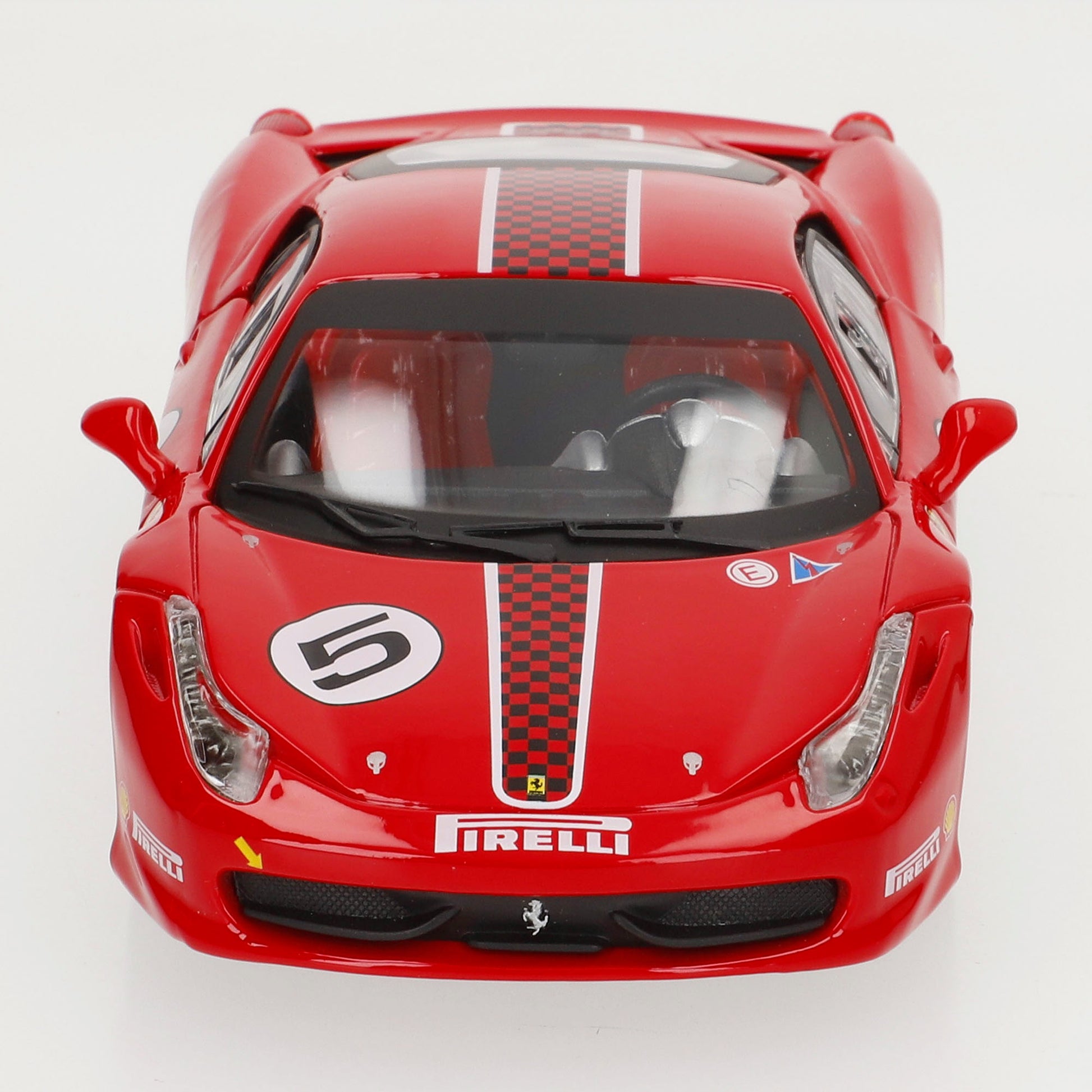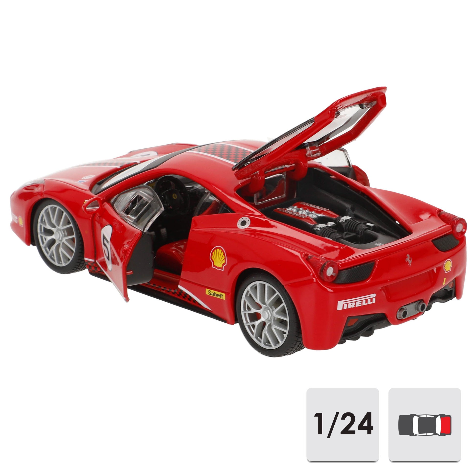 El Ferrari 458 Challenge es una versión de alto rendimiento del icónico Ferrari 458 Italia, optimizada para circuito y utilizada en la Ferrari Challenge, una de las competiciones monomarca más reconocidas del mundo. Esta réplica a escala 1:24 de Burago captura cada detalle del modelo real, desde su carrocería aerodinámica en Rosso Corsa con dorsal #5 hasta los logotipos de sus patrocinadores oficiales, reflejando el diseño de los coches que dominaron las pistas en los campeonatos de Ferrari.