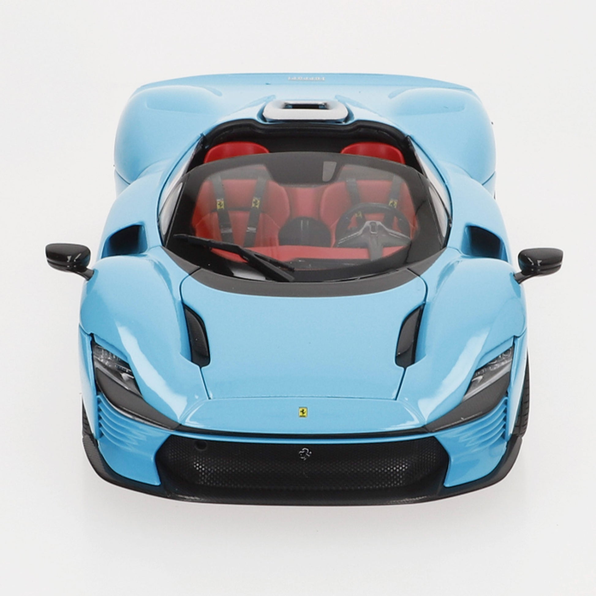 Fabricado en metal fundido (die-cast) con acabados en plástico de alta calidad, este modelo garantiza una estructura sólida y una reproducción minuciosa del vehículo real. Sus puertas de apertura manual tipo mariposa permiten acceder a un interior detallado con acabados en rojo y mandos inspirados en la competición. Su capó trasero abatible deja ver una reproducción del motor V12 atmosférico de 6.5L, que genera 840 CV, convirtiéndolo en el motor más potente jamás fabricado por Ferrari en un coche de producción.