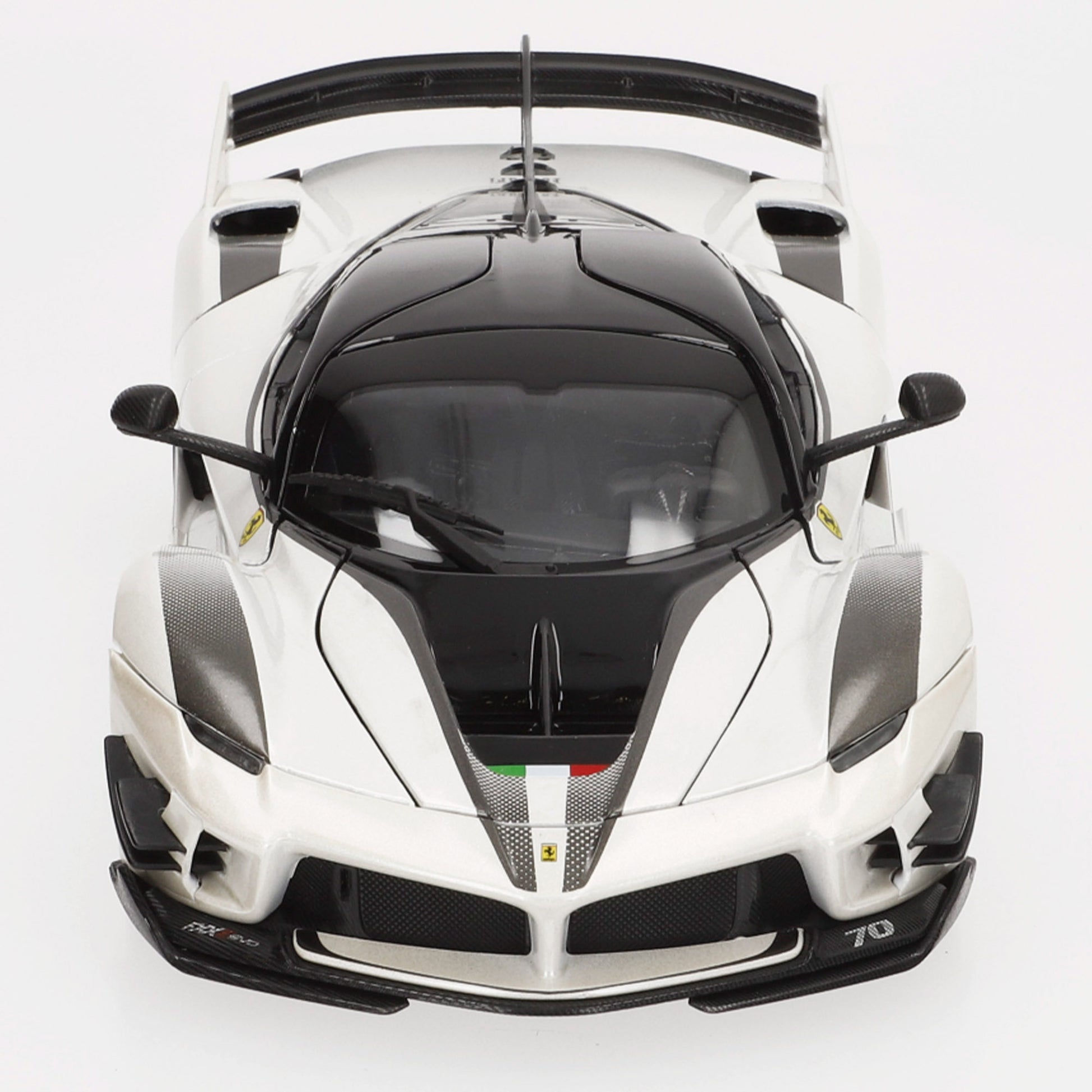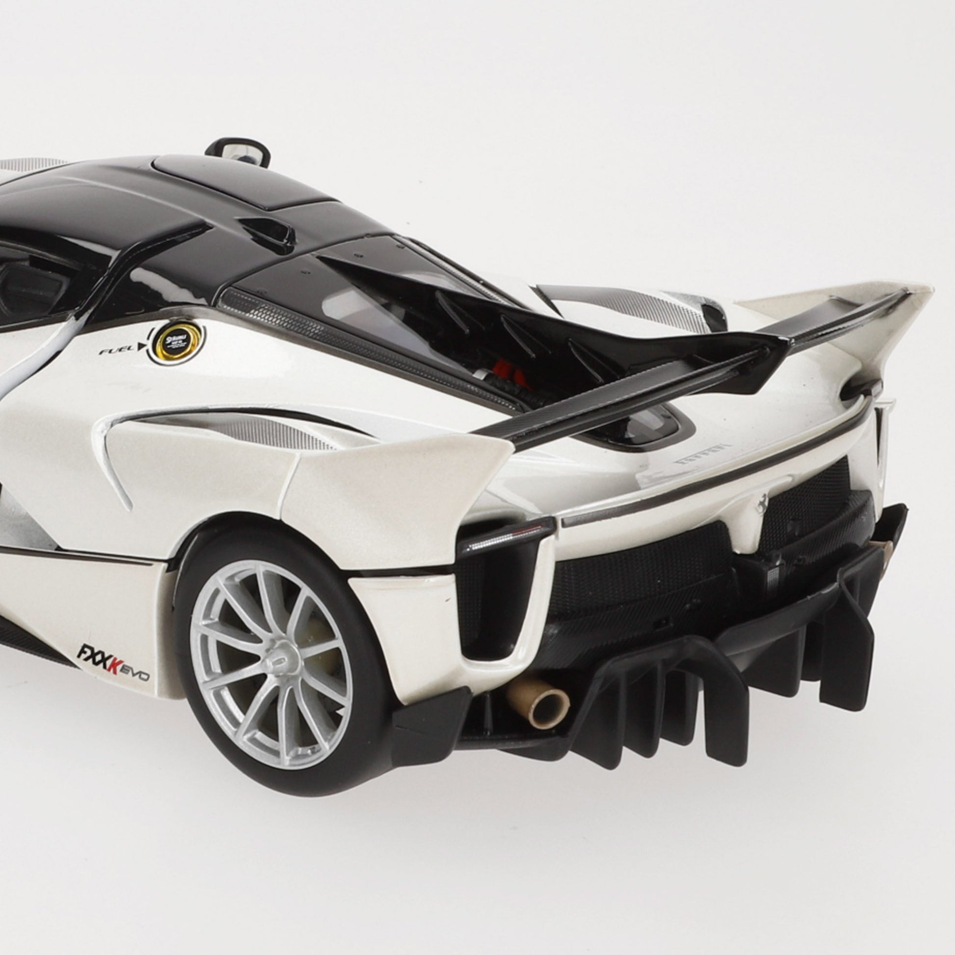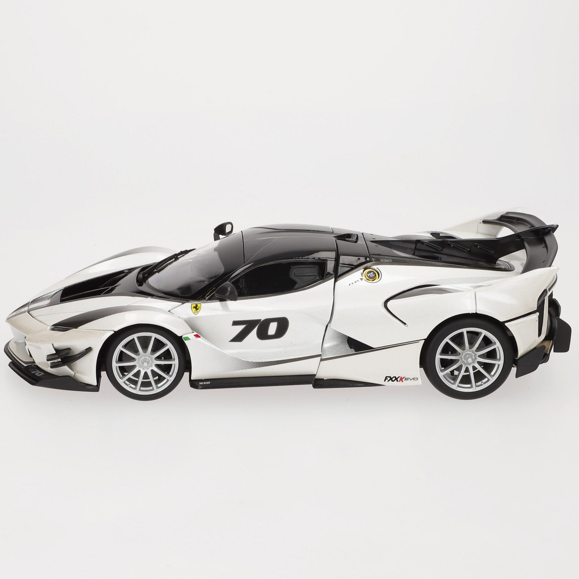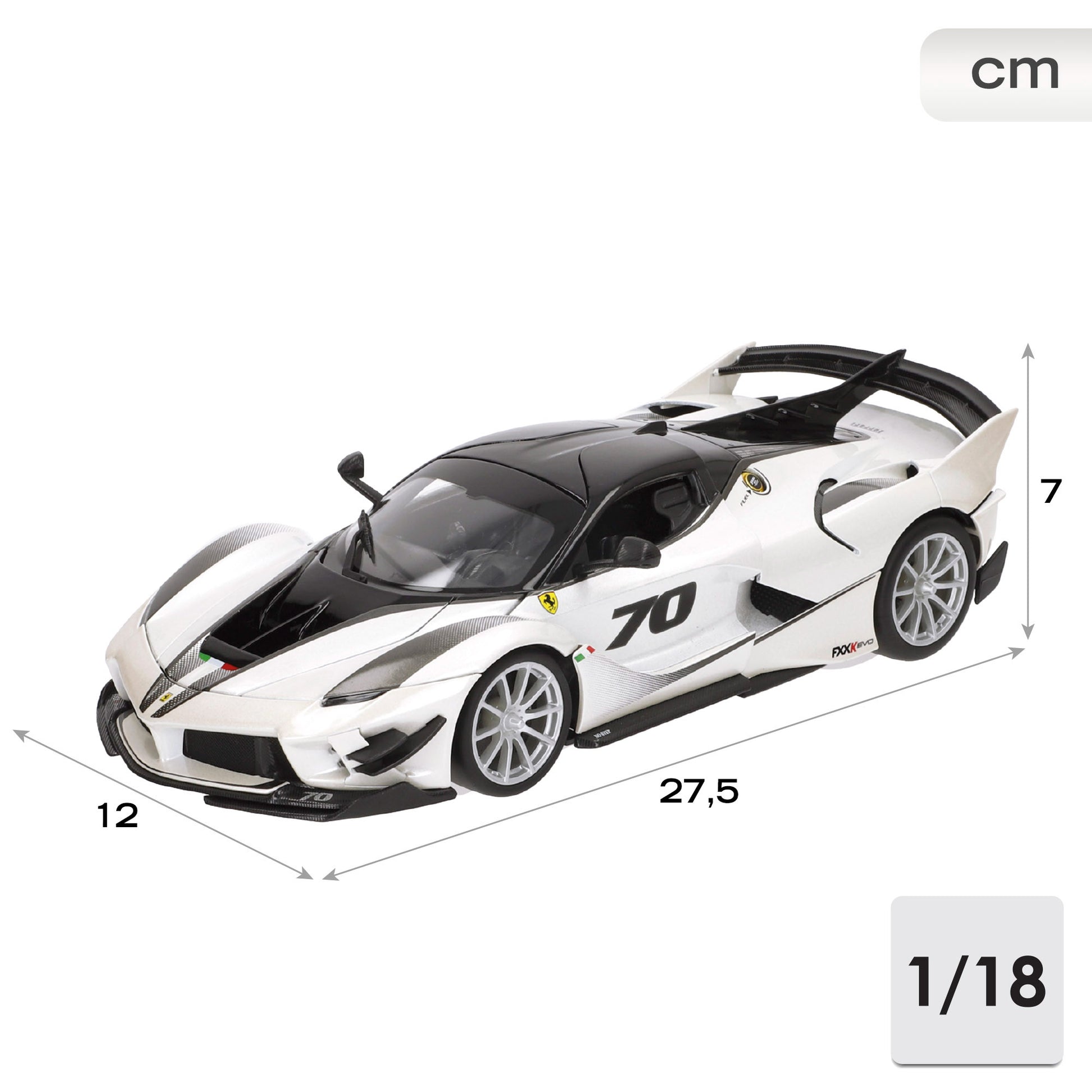 El Ferrari FXX-K Evo es la evolución del FXX-K, un hypercar experimental diseñado exclusivamente para circuito y basado en el icónico LaFerrari. Equipado con un paquete aerodinámico optimizado, incorpora un alerón trasero fijo, nuevas tomas de aire y mejoras en el sistema KERS derivado de la Fórmula 1. Esta maqueta a escala 1:18 captura su diseño innovador con un espectacular acabado en blanco perlado con detalles en negro y el dorsal #70, resaltando su estética futurista y su rendimiento extremo.