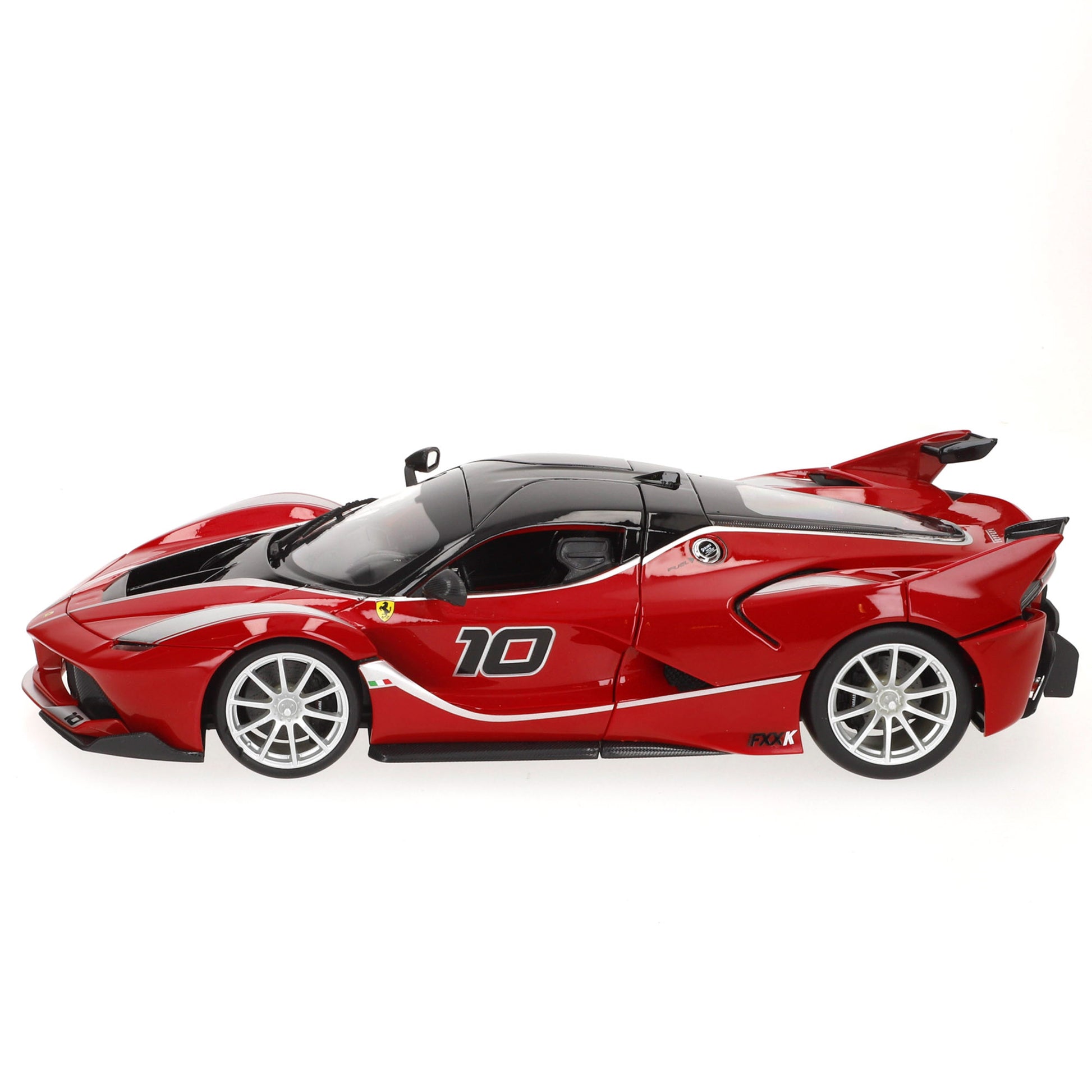 El Ferrari FXX-K es un modelo de alto rendimiento diseñado exclusivamente para pista, basado en el LaFerrari y optimizado con la tecnología más avanzada de la marca italiana. Su diseño aerodinámico incorpora un doble alerón trasero flotante, difusores optimizados y un sistema HY-KERS derivado de la Fórmula 1, que en su versión real genera 1.050 CV combinados. Su espectacular acabado en Rosso Corsa con techo negro, detalles en blanco y el dorsal #10 le otorgan una presencia imponente en cualquier colección.