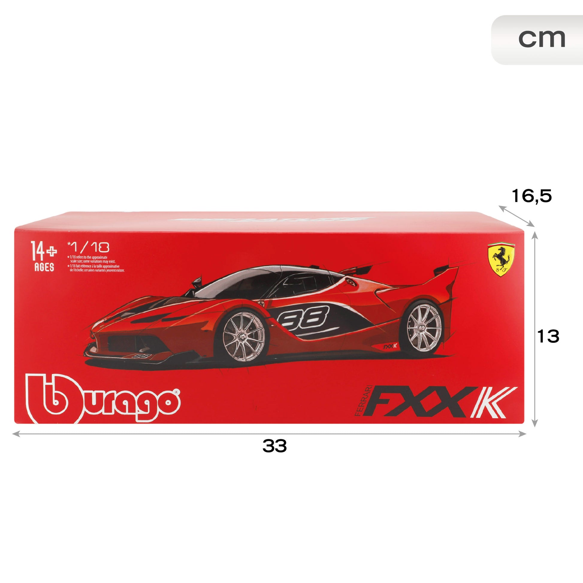 Este modelo oficial de Ferrari a escala 1:18, fabricado por Burago, está recomendado para mayores de 14 años. Su nivel de detalle y fidelidad lo convierten en una pieza imprescindible en la vitrina de cualquier coleccionista que disfruta coleccionando maquetas de alta calidad inspiradas en los vehículos más exclusivos de la historia.