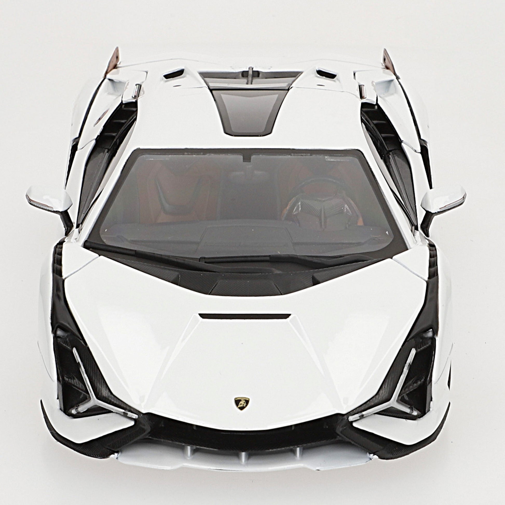 Fabricado en metal fundido (die-cast) con acabados en plástico de alta calidad, este coche cuenta con puertas de apertura manual que permiten observar su interior detallado. Además, su capó trasero deja ver una reproducción del motor V12 híbrido, reflejando la avanzada ingeniería de Lamborghini.