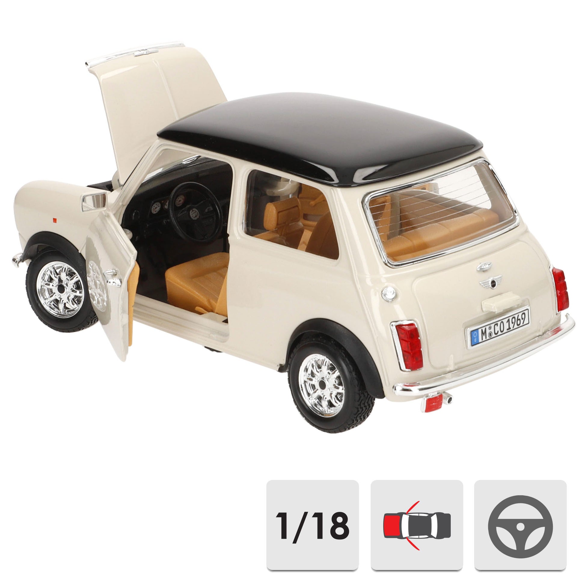 El Mini Cooper 1969 es un coche que dejó huella en la historia del automovilismo gracias a su diseño compacto, ágil y versátil. Este modelo a escala 1:18 de Burago reproduce fielmente sus líneas clásicas, su carrocería en crema con techo negro, su parrilla cromada y sus faros redondos, manteniendo la esencia del icónico coche británico.