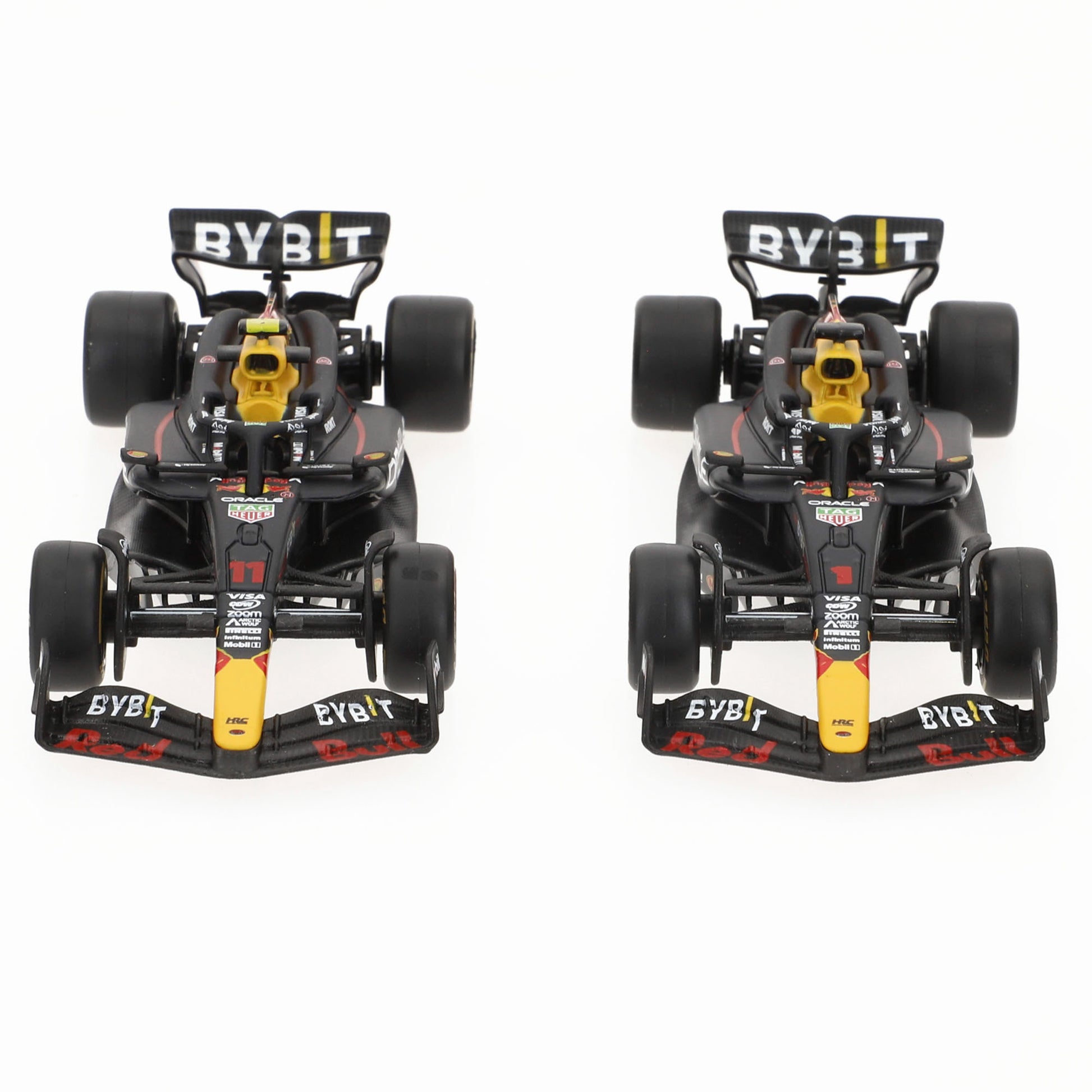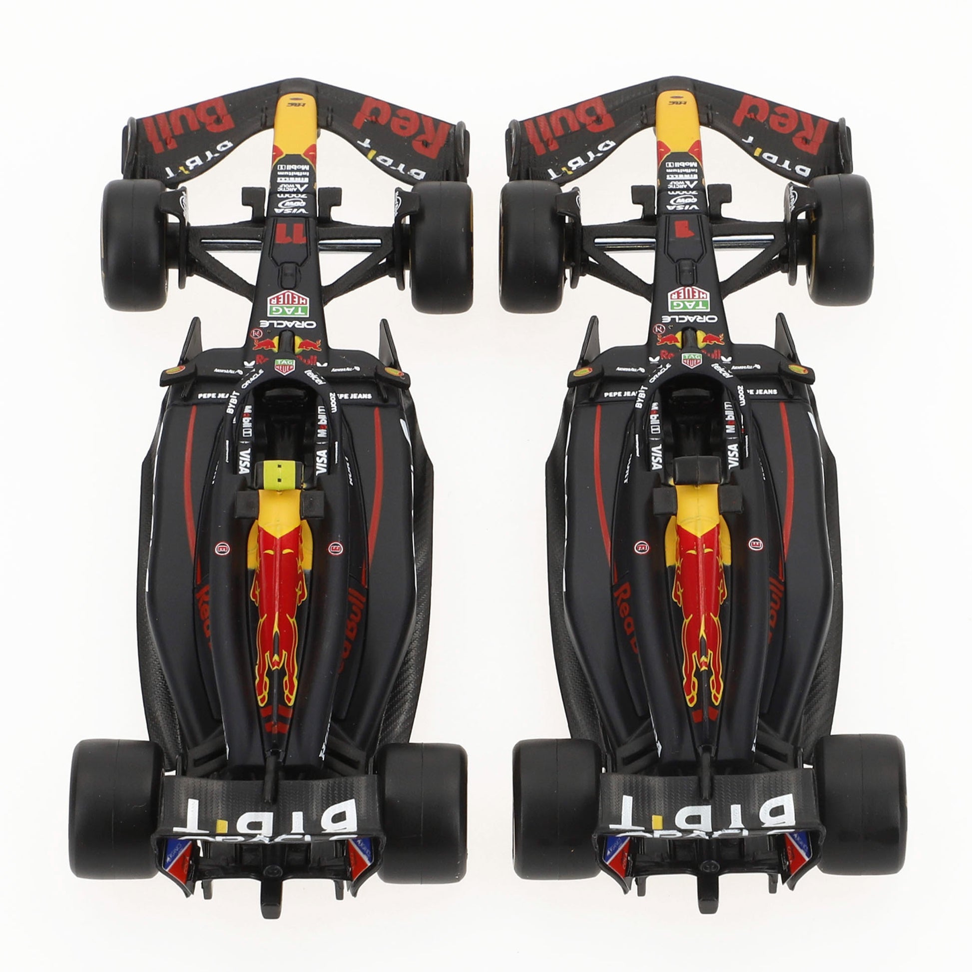 El set incluye dos coches a escala 1:43, representando los monoplazas con los números Nº11 de Sergio Pérez y Nº1 de Max Verstappen. Ambos coches cuentan con un acabado de alta precisión, reflejando todos los detalles que los hicieron icónicos en la pista. Estos modelos son perfectos para exhibir o recrear emocionantes carreras con el equipo Red Bull.