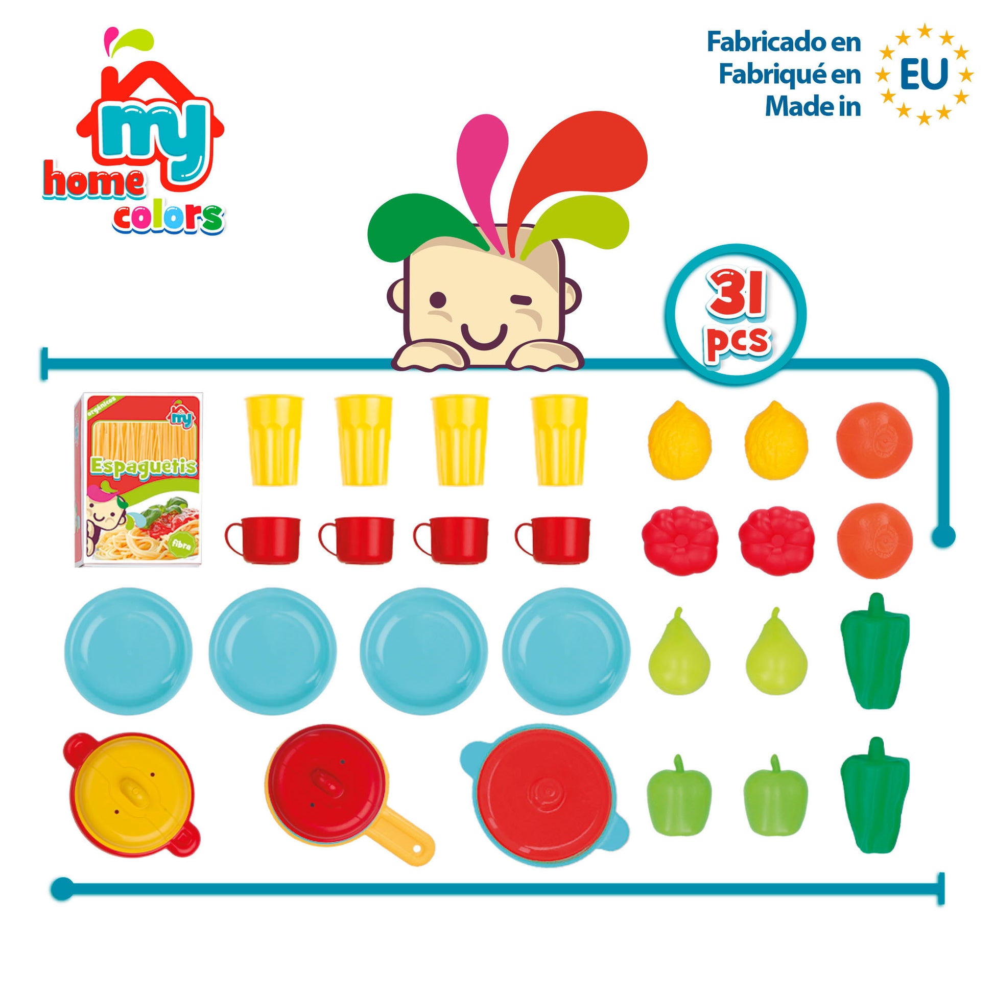 Caja de comida y accesorios de cocina para niños a partir de 24 meses. Juega con este set de alimentos y cocina deliciosos platos en la sartén y la olla. Prepara la mesa y ¡a comer!. Incluye 31 piezas: 2 pimientos verdes, 2 tomates, 2 limones, 2 naranjas, 2 peras, 2 manzanas, 1 caja de espaguetis, 4 vasos, 4 tazas, 2 platos, 1 olla, 1 sartén, 1 cazuela y 3 tapas.