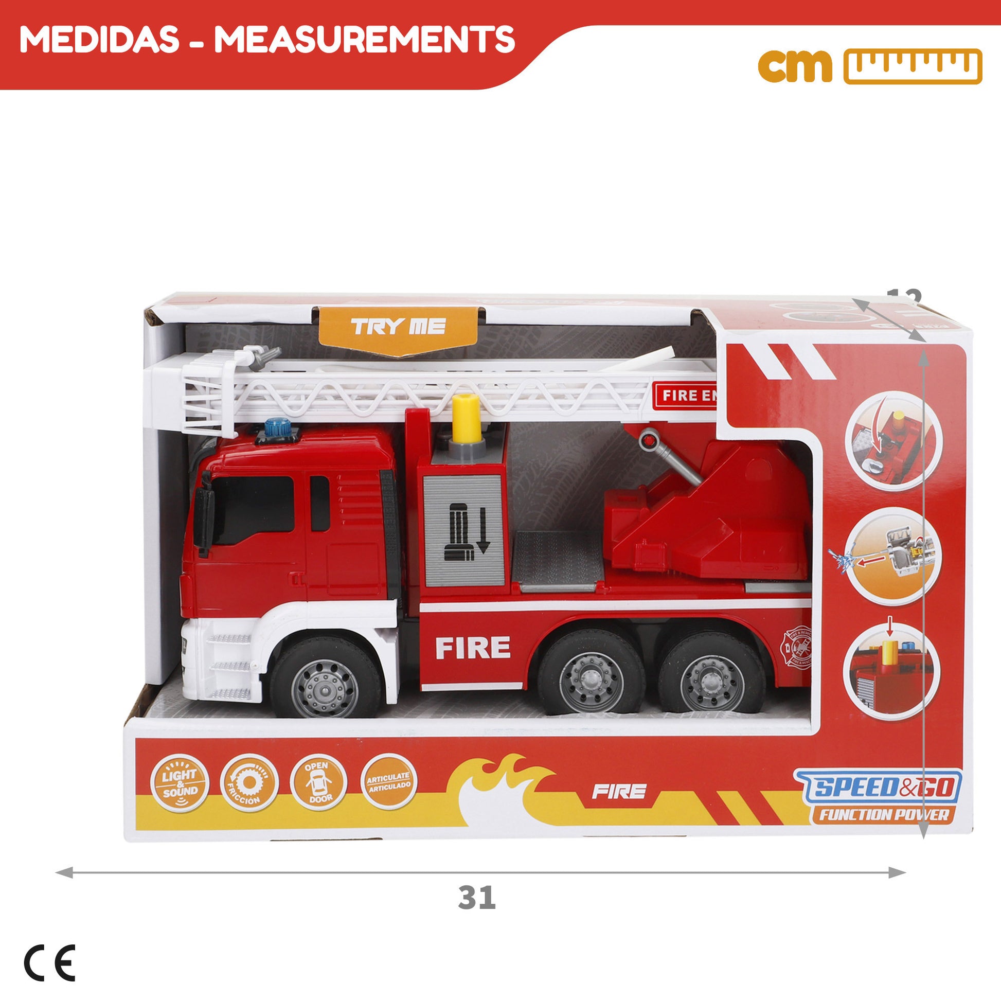 Este camión de bomberos de juguete está recomendado a partir de los 3 años. Funciona con un sistema de fricción, lo que significa que no requiere pilas para moverse, pero sí para las luces y sonidos (3 AG13/LR44 incluidas). Tiene un tamaño de 26x9x14 cm (escala 1:14) para que los niños lo manejen con facilidad. Perfecto para incentivar el juego imaginativo y para aquellos apasionados de los vehículos y la acción.