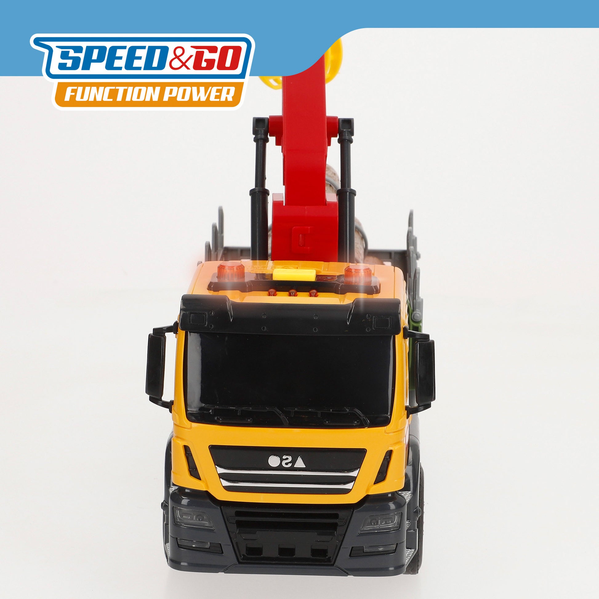 Este camión maderero Speed & Go es ideal para los pequeños constructores que disfrutan moviendo grandes cargas. Equipado con luces y sonidos reales, está listo para recoger troncos y llevarlos a su destino. ¡Solo tienes que empujarlo hacia atrás y soltarlo para que avance como un camión de verdad!