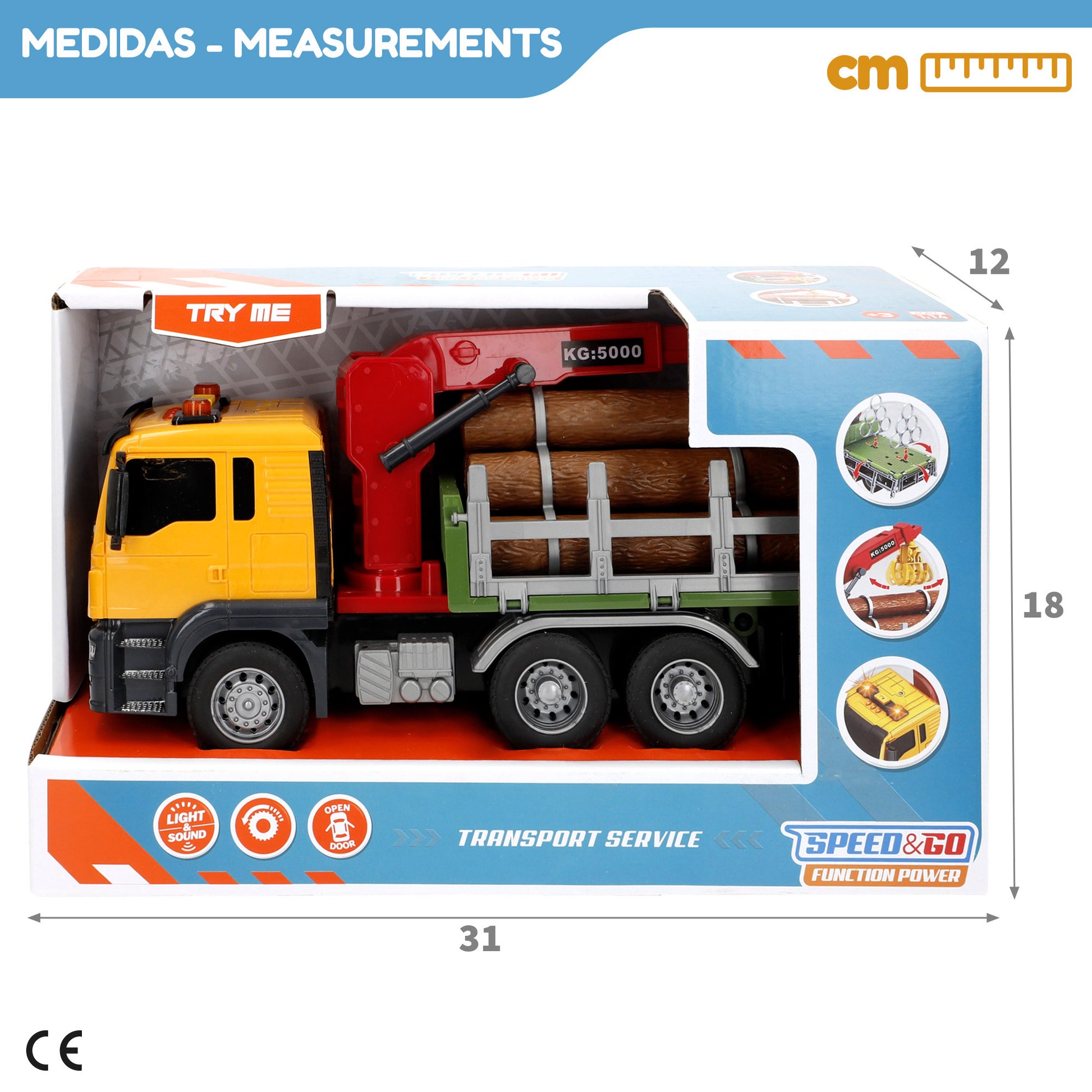 Este camión maderero cuenta con luces y sonidos realistas que se encienden al pulsar un botón. Su grúa es articulada y permite agarrar los troncos con facilidad. Además, las barreras laterales y trasera son abatibles para facilitar la carga y descarga de materiales. El camión cuenta con sistema de fricción que permite que el camión avance fácilmente sin necesidad de pilas para moverse, ¡solo empuja y suelta!