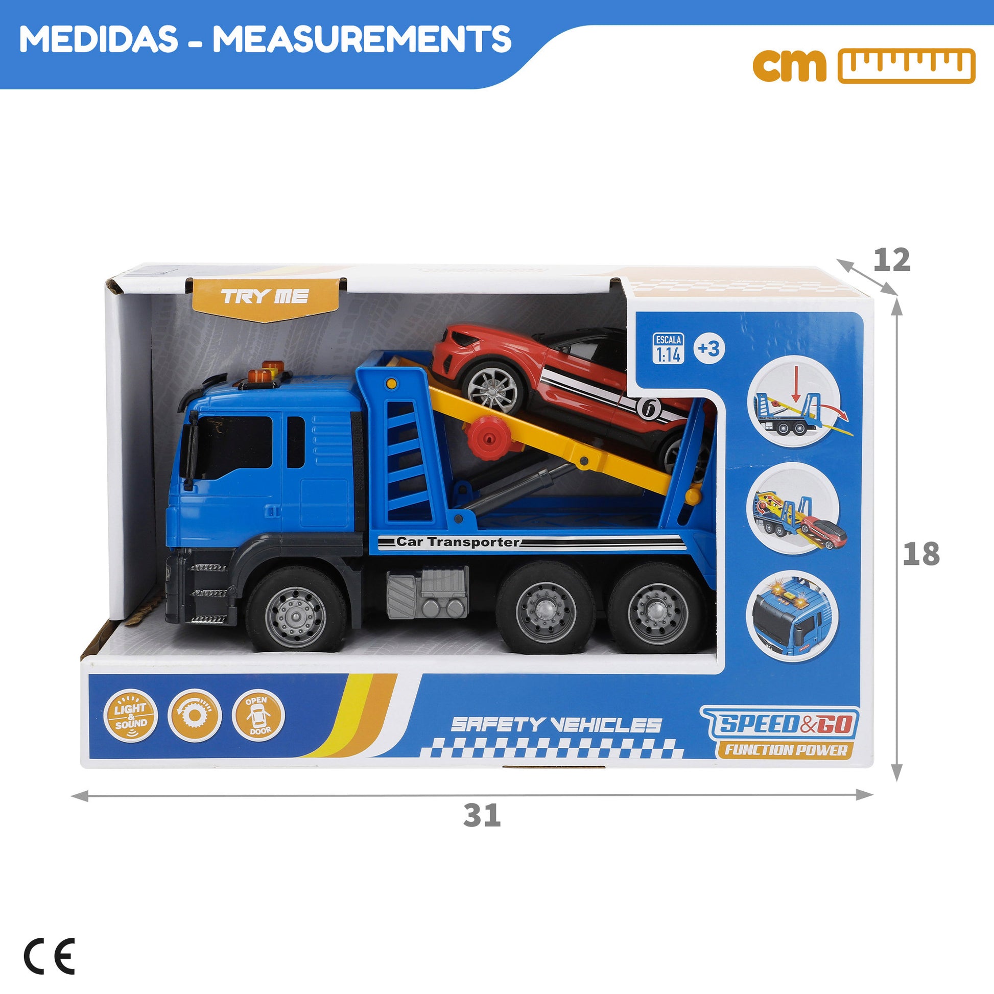 Este camión portavehículos incorpora luces y sonidos realistas que se activan al pulsar un botón. Dispone de una rampa manual y una puerta trasera abatible que facilitan la carga y descarga del coche incluido. Además, su sistema de fricción permite que el camión avance fácilmente sin necesidad de pilas para moverse, ¡solo empuja y suelta!