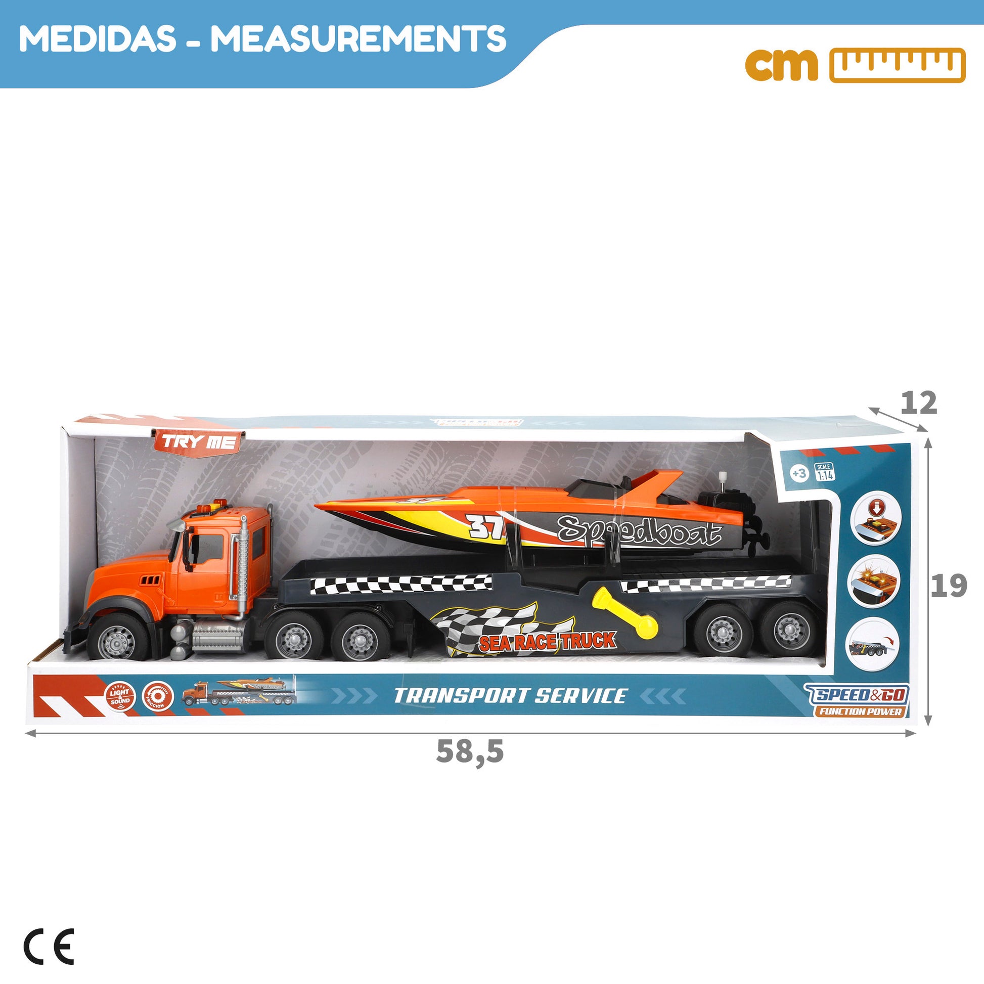 El set cuenta con un camión tráiler a escala 1:14 con plataforma trasera que permite cargar y descargar la lancha de manera sencilla. El camión incluye botones que activan luces y sonidos realistas, y funciona con sistema de fricción para impulsarlo hacia delante fácilmente. La lancha, de diseño deportivo, completa el pack para que los peques puedan inventar sus propias misiones en tierra y carreras en el agua.