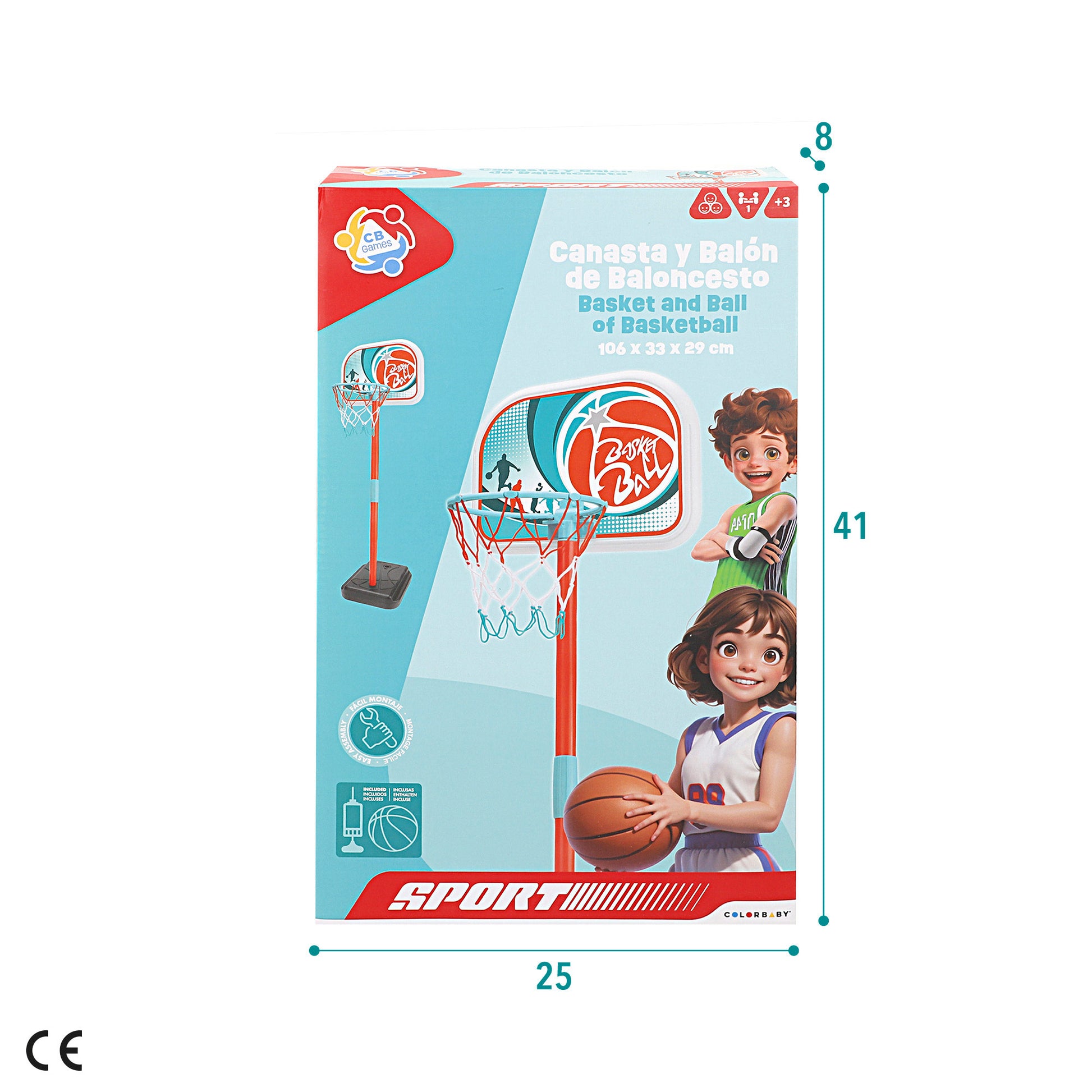 La canasta montada mide 33 cm de ancho x 29 cm de largo x 106 cm de alto. El tablero mide 33 cm de ancho y 24,5 cm de alto y el aro es de 18 cm de diámetro. Es fácil de montar y transportar y está recomendada para niños a partir de 3 años.
