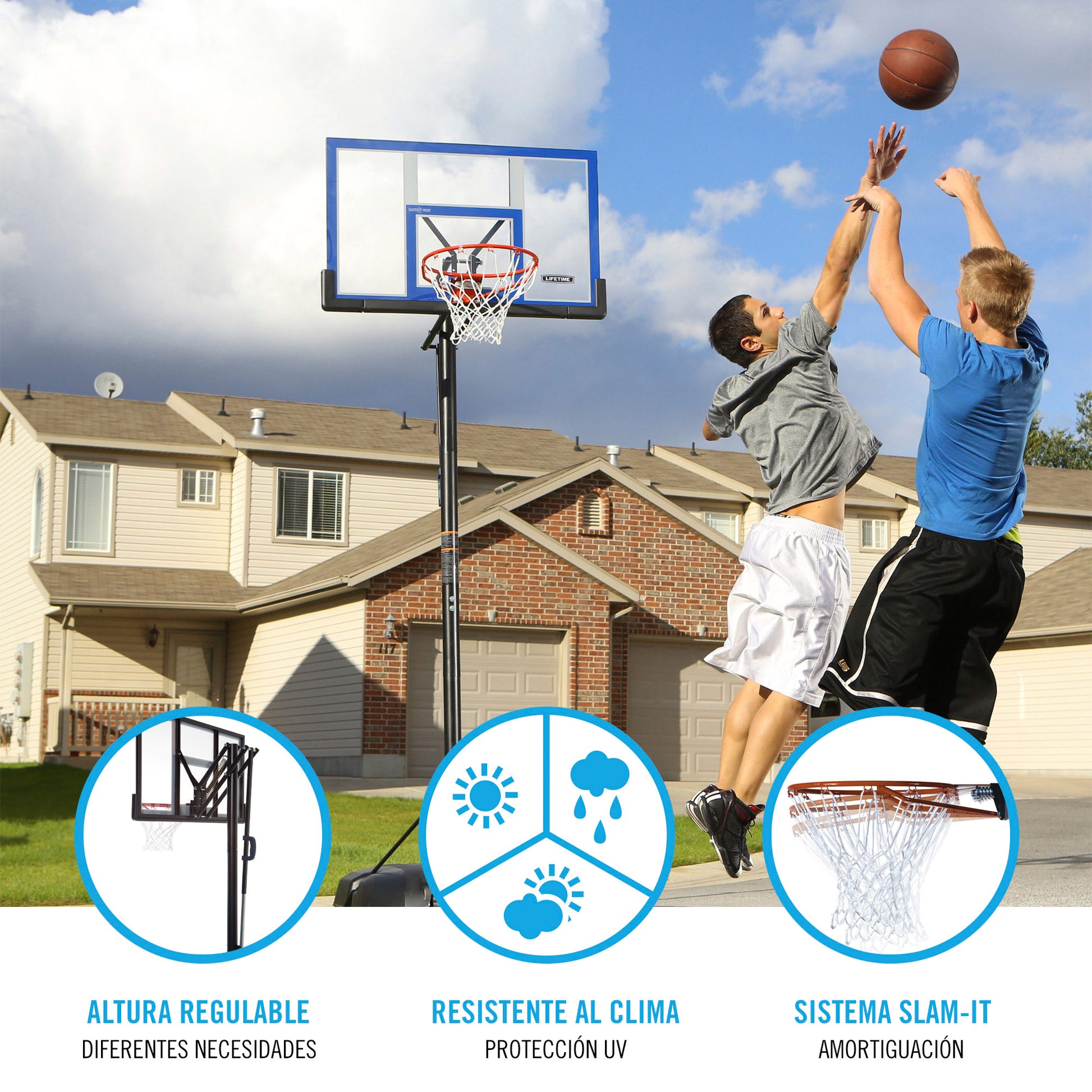 Esta canasta de baloncesto LIFETIME está formada por un tablero transparente de policarbonato de 48 pulgadas a prueba de golpes con marco de acero inoxidable y con un refuerzo inferior de polietileno soplado. Su diseño es de apariencia profesional, con gráficos serigrafiados en color azul y protección UV para unos colores intactos de por vida. En el centro, el tablero incorpora el aro central Slam-It® de 46 cm de diámetro con red de nylon resistente al clima. El sistema Slam-It® permite que el aro resista a todos los tiros y golpes realizados durante los partidos, gracias a su muelle trasero incorporado, la estructura consigue la flexibilidad necesaria para soportar los lanzamientos más agresivos.