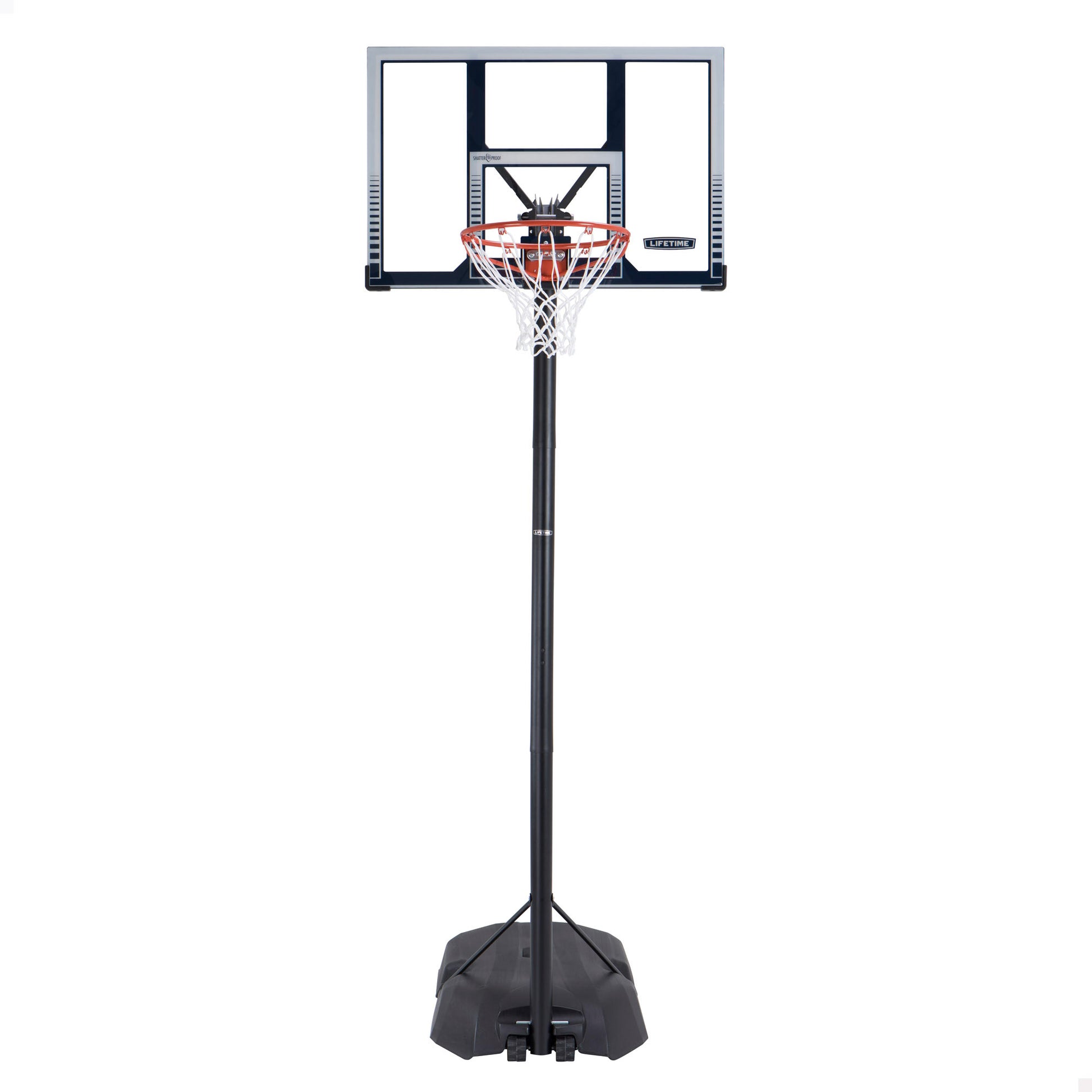 Esta canasta de baloncesto LIFETIME está formada por un tablero transparente de policarbonato de 44 pulgadas a prueba de golpes con marco de acero inoxidable y con un refuerzo inferior de polietileno soplado. Su diseño es de apariencia profesional, con gráficos serigrafiados en color blanco y protección UV para unos colores intactos de por vida. En el centro, el tablero incorpora el aro central Slam-It® de 46 cm de diámetro con red de nylon resistente al clima. El sistema Slam-It® permite que el aro resista a todos los tiros y golpes realizados durante los partidos, gracias a sumuelle trasero incorporado, la estructura consigue la flexibilidad necesaria para soportar los lanzamientos más agresivos.