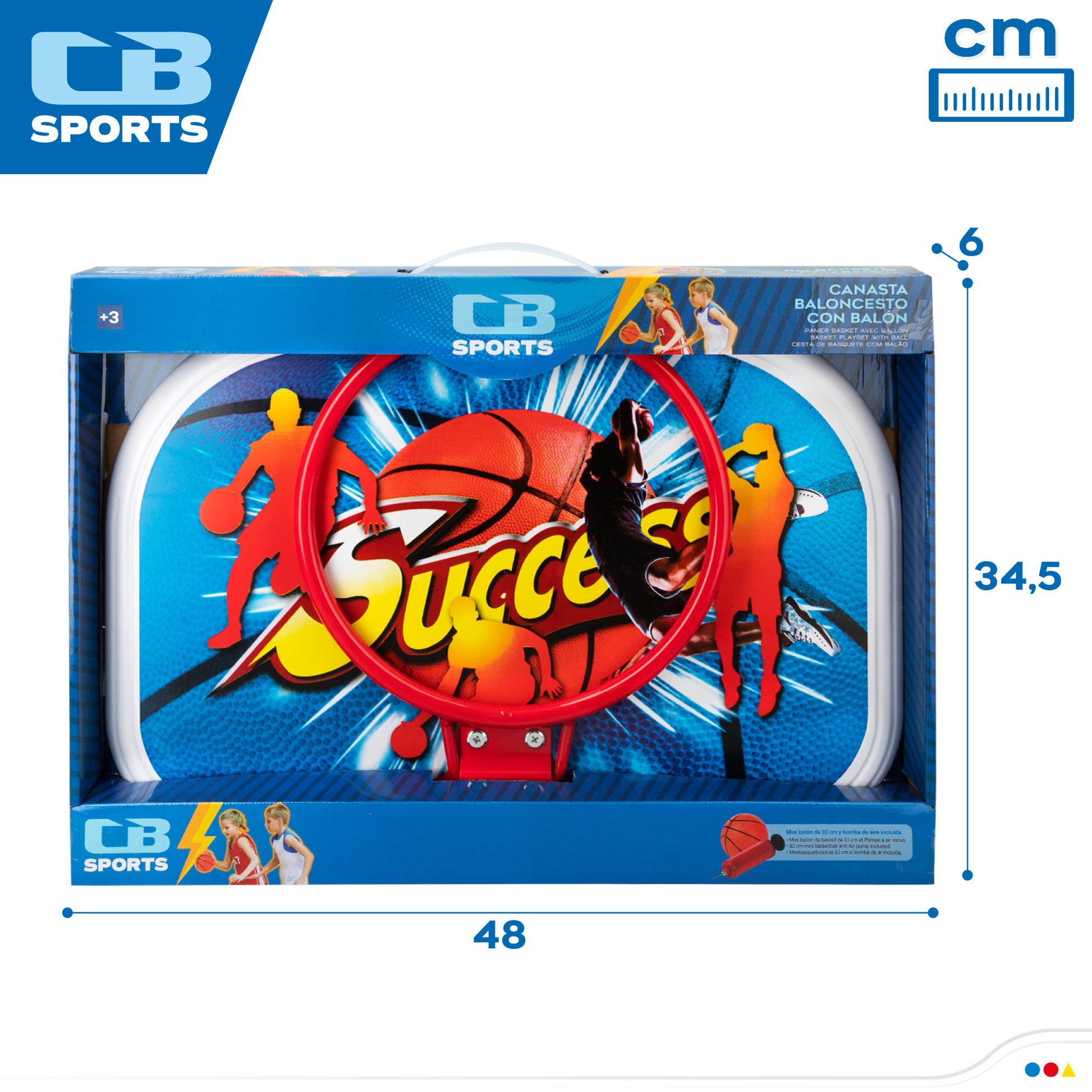 Canasta de baloncesto CB Toys. ¡Practica tu deporte favorito y conviértete en un pro del basket! Esta canasta tiene un marco para colgar en cualquier pared, aro metálico y red de poliéster. Incluye una pelota de 13 cm de diámetro y un hinchador para inflarla. Las medidas del tablero son 46x3x33 cm y la canasta mide25 cm de diámetro. ¡Haz un triple! Juguete recomendado a partir de 3 años.