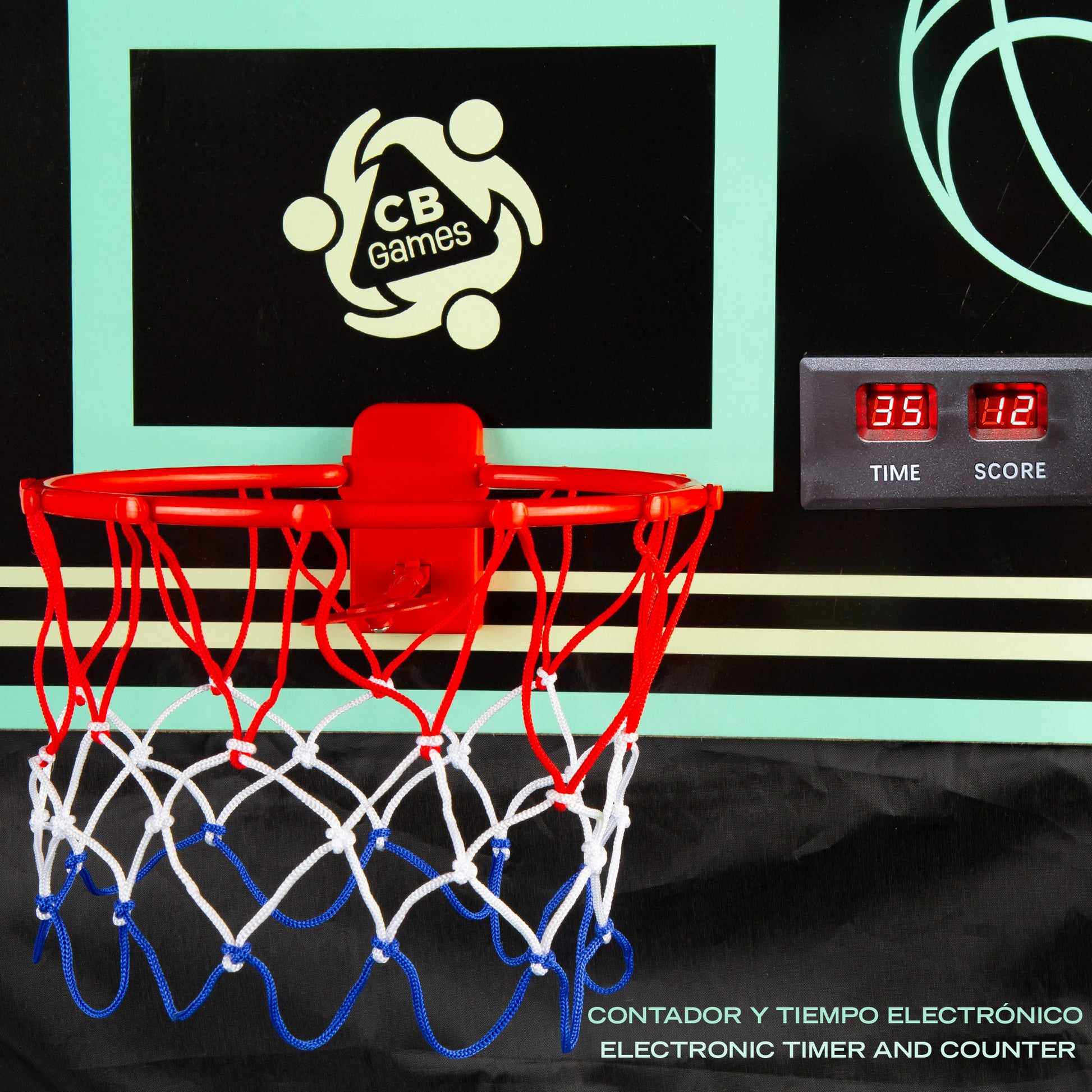 Este set de CB Games incluye una canasta de baloncesto con estructura de metal y tablero decorado, un marcador electrónico que registra los puntos automáticamente y balones de tamaño infantil con un diseño ligero para facilitar el lanzamiento.
