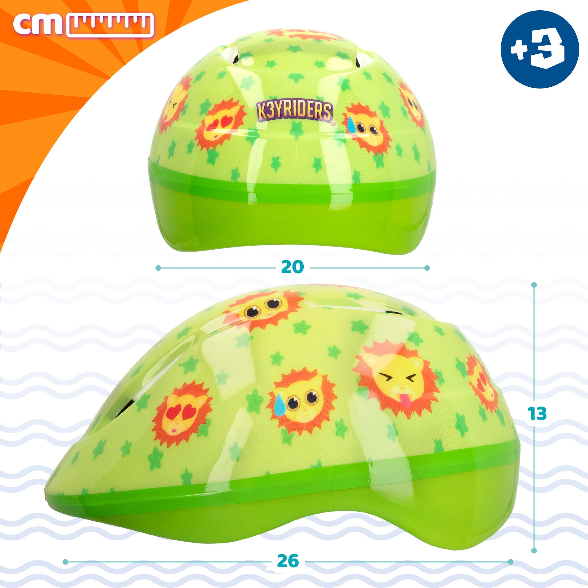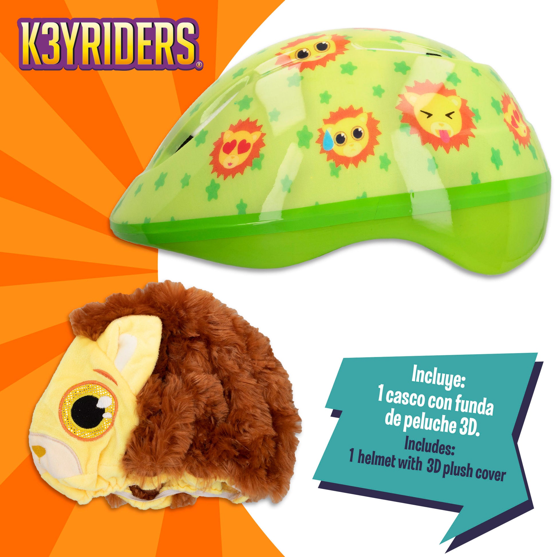¡Protégete con el casco más adorable de todos! Este casco K3YRIDERS cuenta con un diseño verde con leones estampados y una funda de león de peluche súper suave para colocarla sobre el casco. Con medidas 20x26x13 cm, recomendado para niños a partir de 3 años.