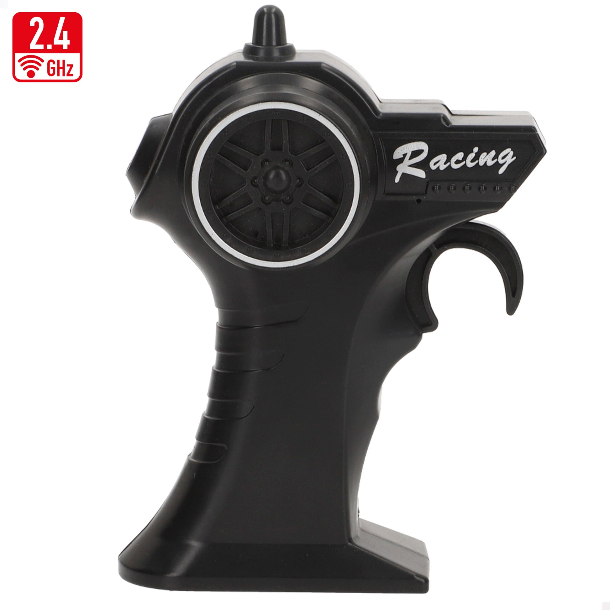 El coche incluye un mando teledirigido ergonómico de estilo pistola que funciona a 2.4 GHz con 3 canales, ideal para disfrutar de un control preciso y sin interferencias. Permite moverlo en 6 direcciones: hacia adelante/atrás en dirección recta o hacia adelante/atrás girando a izquierda o a derecha. Alcanza una velocidad aproximada de 12 km/h y tiene una autonomía de 20 minutos. ¡Este coche lo tiene todo para una diversión sin límites!