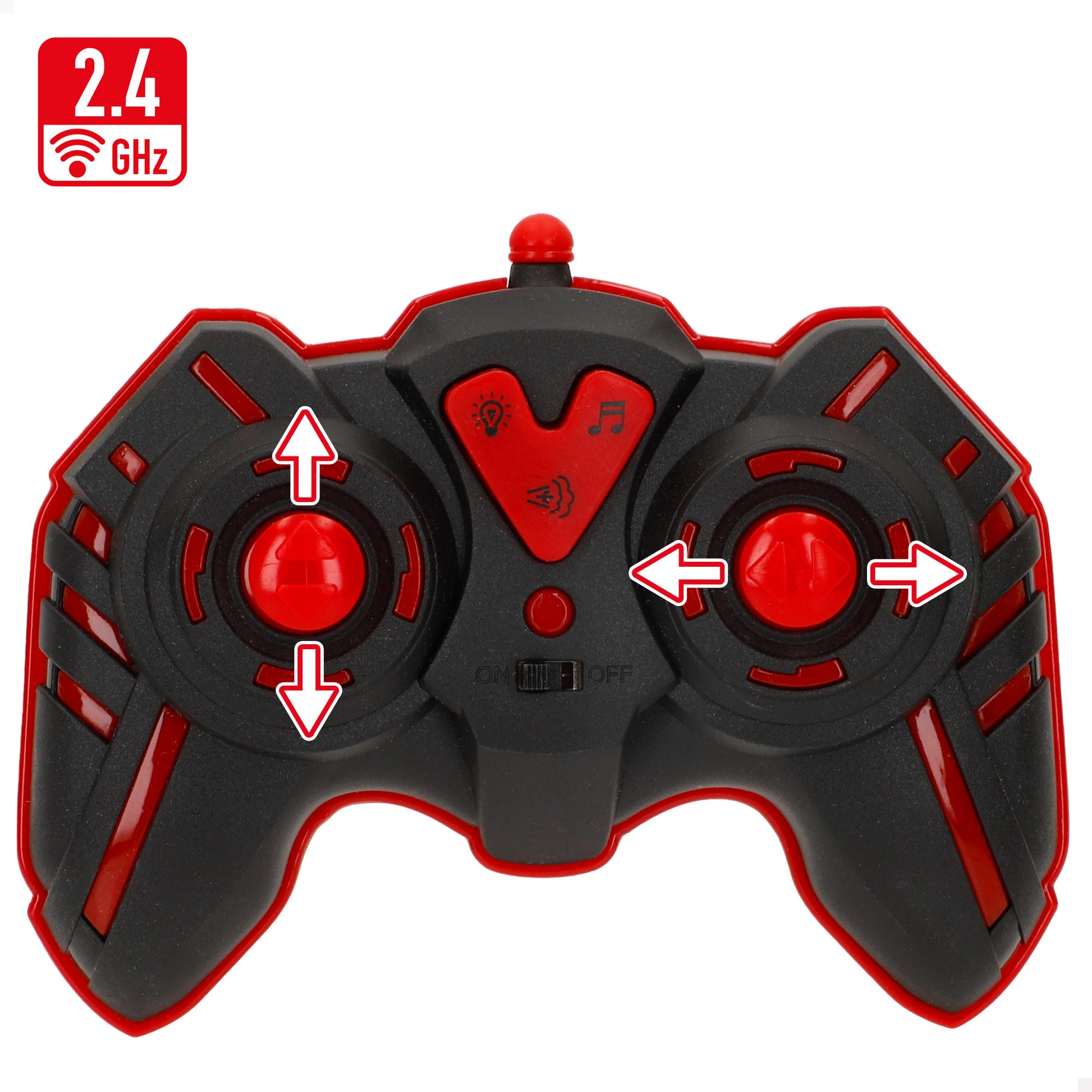 Este vehículo funciona con tecnología radiocontrol a 2.4 GH.z y permite moverlo en 6 direcciones: hacia adelante/atrás en dirección recta o hacia adelante/atrás girando a izquierda o a derecha. Alcanza una velocidad de 8-10 km/h y su potente tracción permite superar terrenos inclinados de hasta 50°. Cuenta con tres modos de luz y melodías y depósito de agua para un increíble efecto de humo. ¡Este coche lo tiene todo para una diversión sin límites!