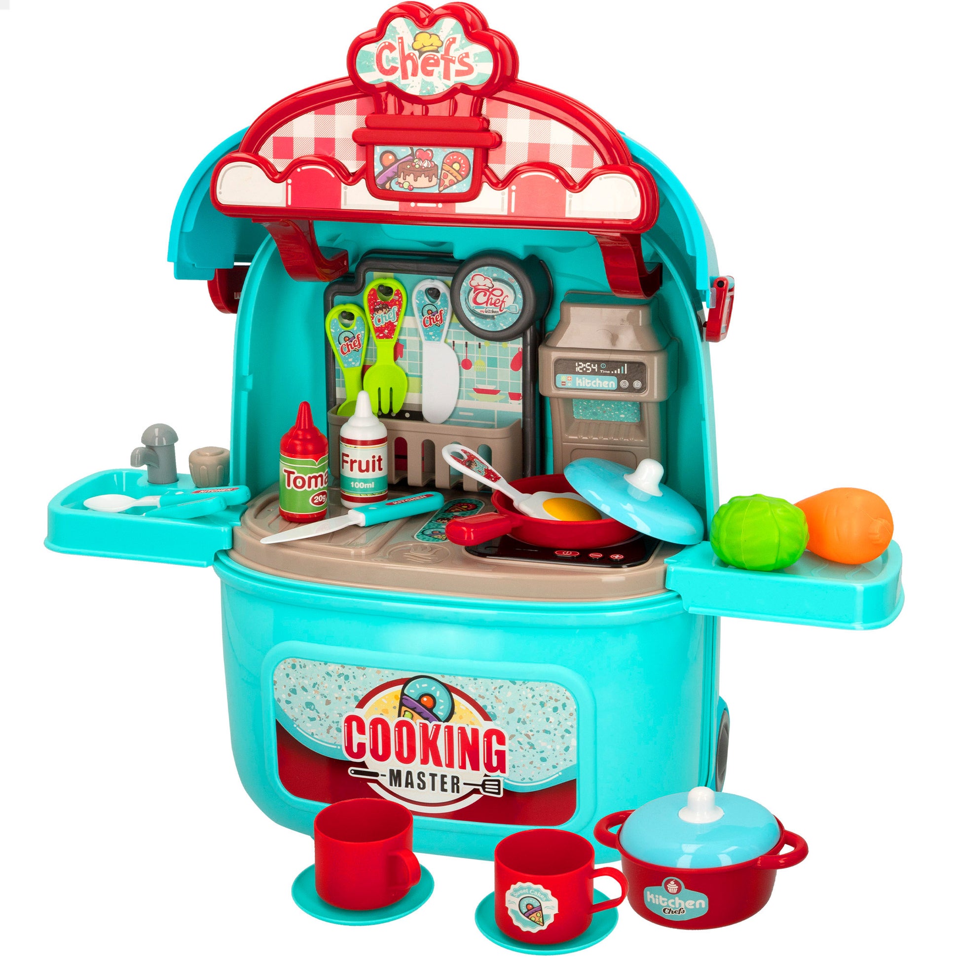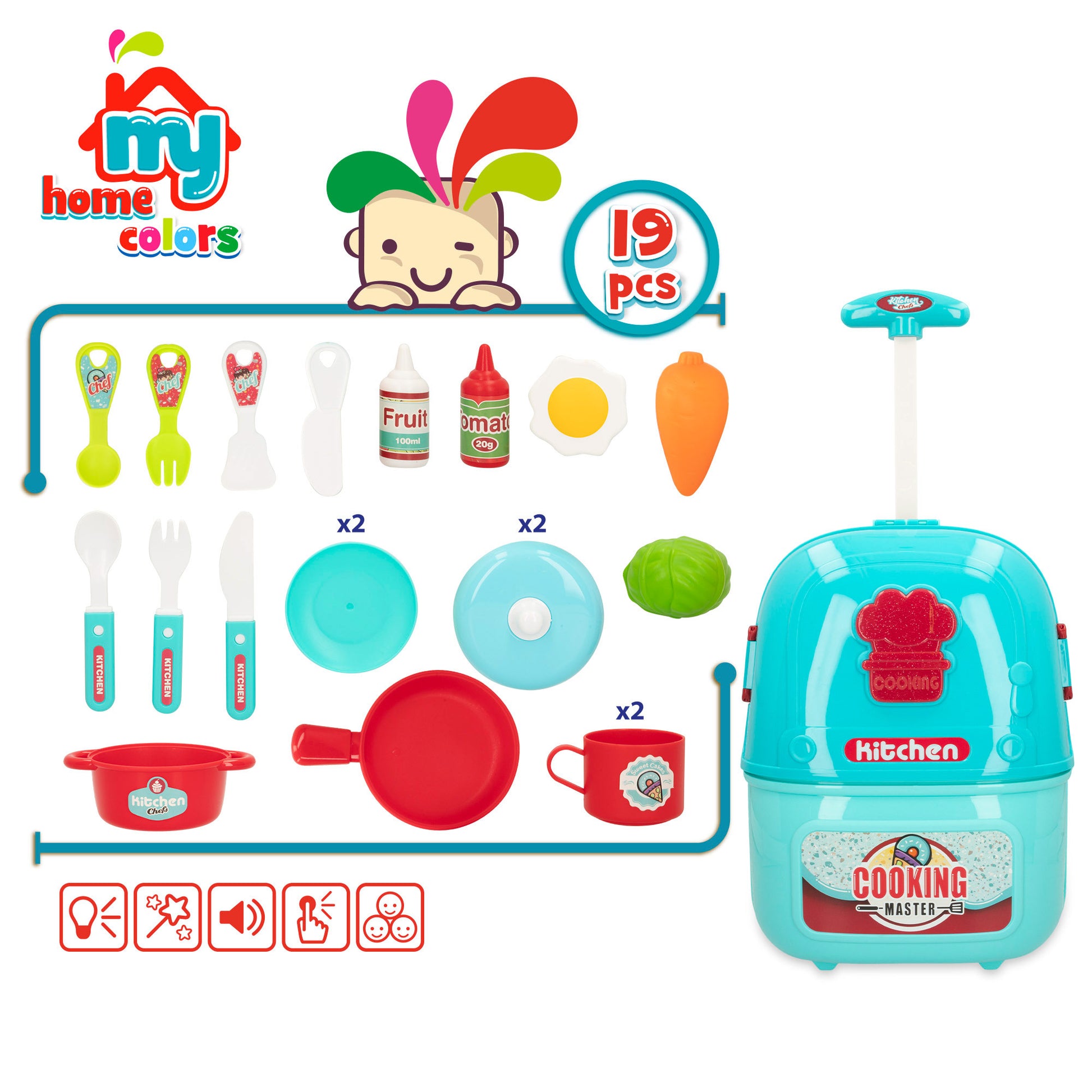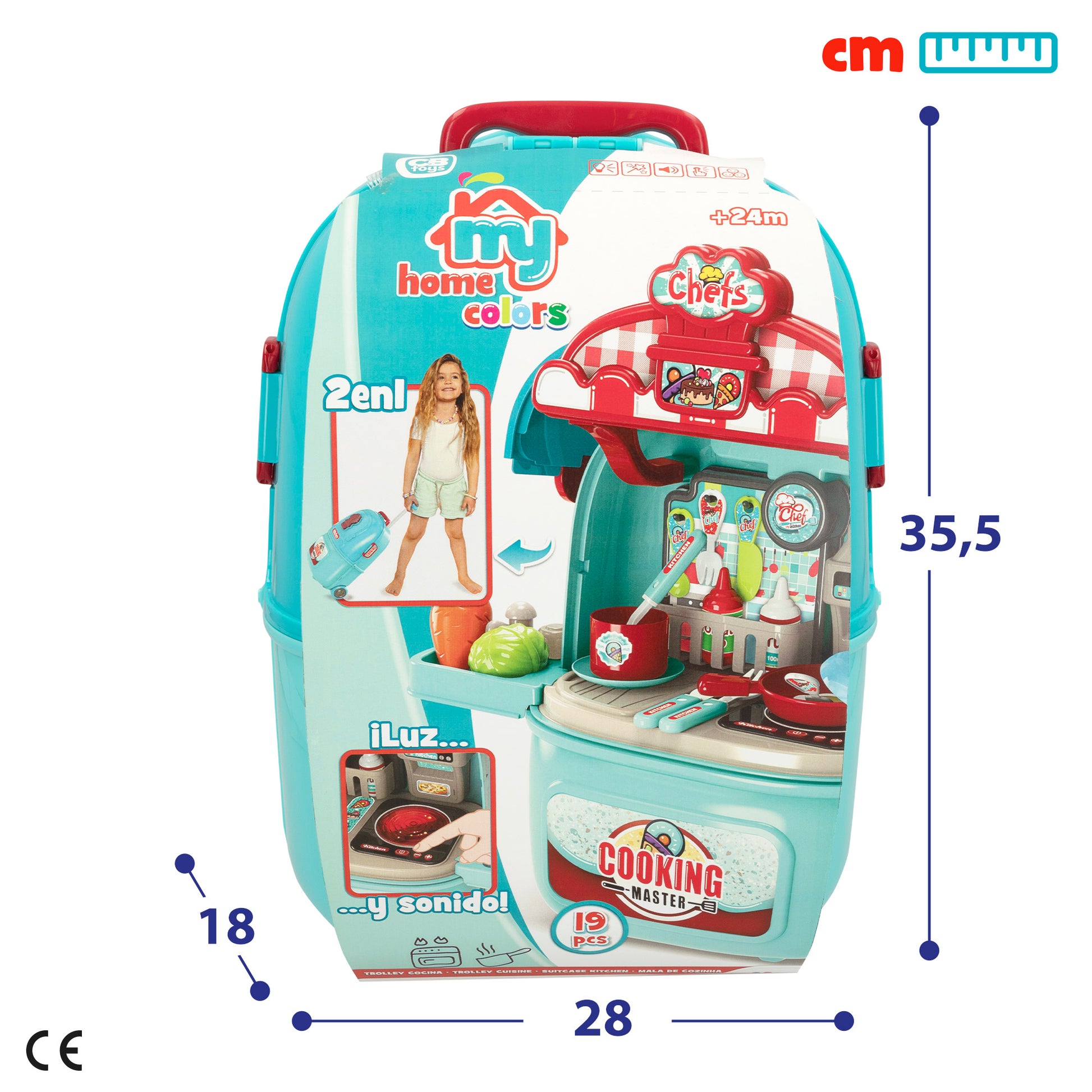 ¡Elabora platos gourmet con tu cocinita portátil My Home Colors y haz que todos se chupen los dedos! Esta maletita con ruedecitas y asa se transforma en segundos en una cocinita con muchos utensilios para que puedas preparar tus recetas más deliciosas. ¡Ñam, ñam! Además, la vitrocerámica emite luz y sonido para que la experiencia de juego mientras cocinas sea más realista. ¡Es genial! Con ella, podrás cocinar como lo hacen los mayores e invitar a todos tus amigos a probar tus creaciones.