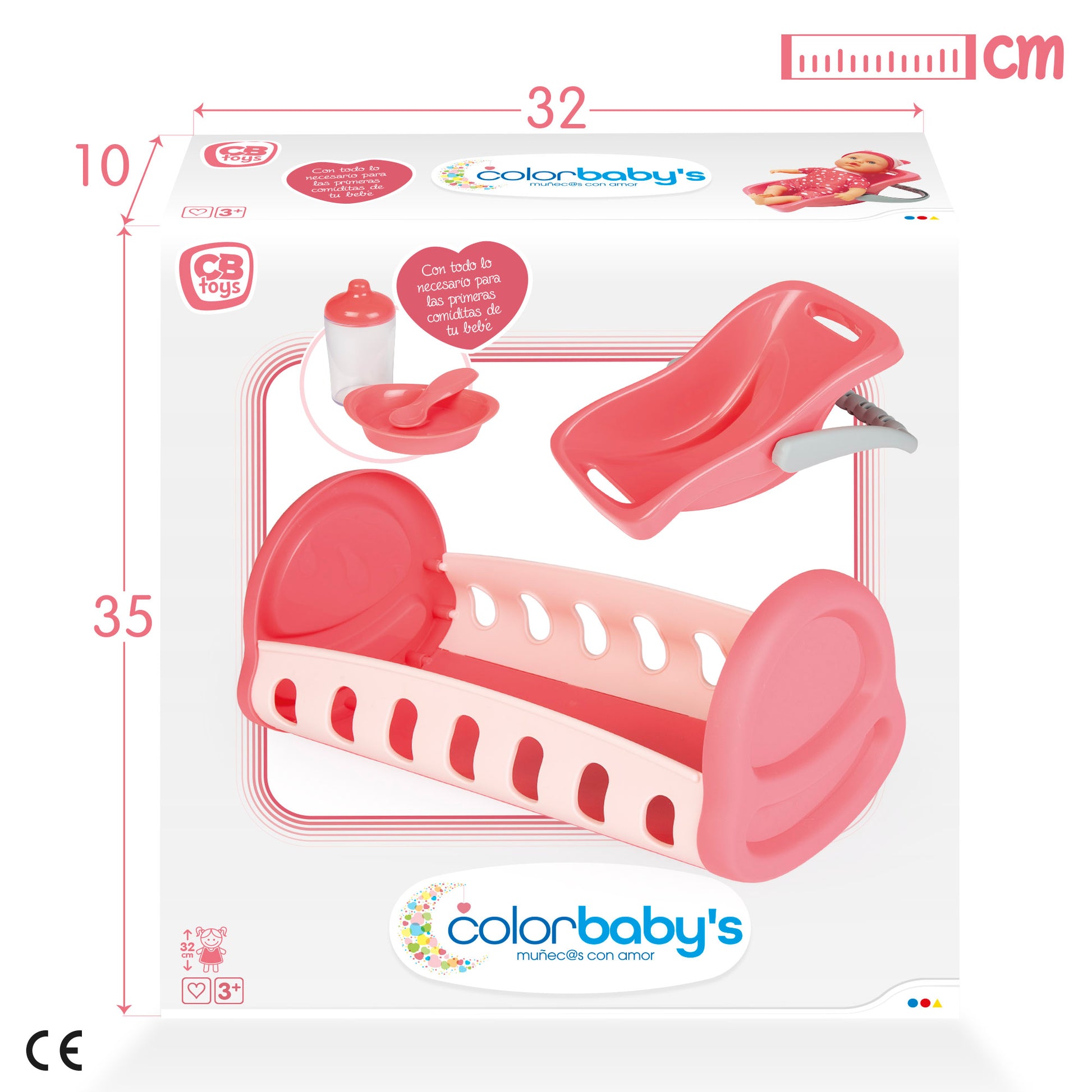 Set cuna, portabebés y accesorios CB Toys para los primeros cuidados de tubebé. ¡Conviértete en una auténtica mamá! Los accesorios están diseñados para muñecas de 32 cm y tienen un dulce y bonito diseño en rosa pastel que le encantará a tu peque. La cunita se mece y el portabebés tiene asa para transportar y se mantiene en pie. Juguete simbólico recomendado para niños a partir de 3 años.