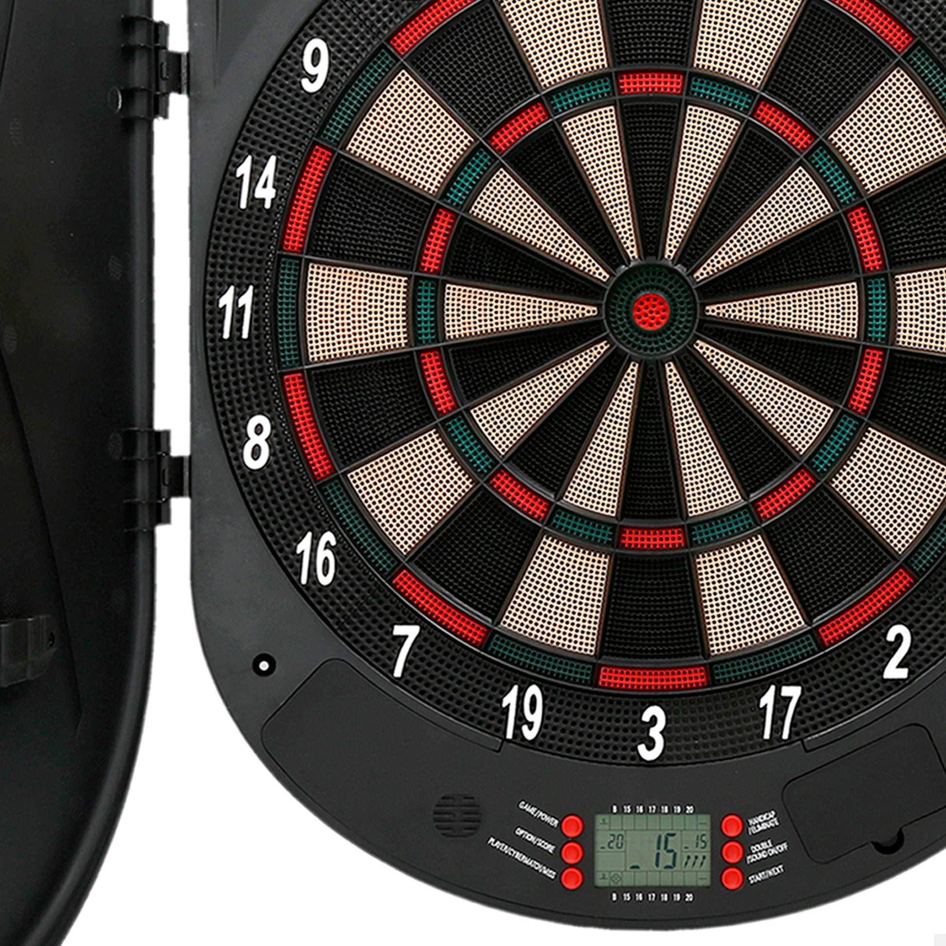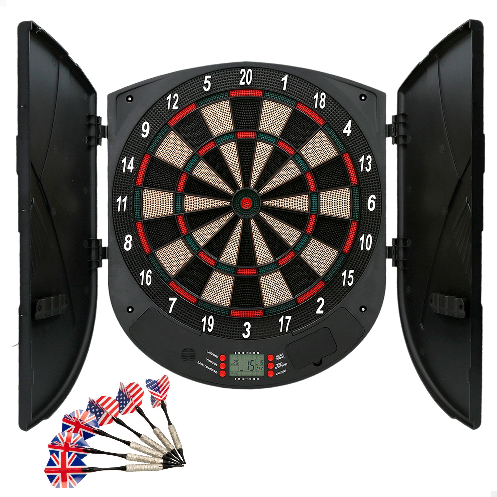 ¡Diviértete a los dardos! La diana electrónica mide 54 cm de diámetro y puedenjugar hasta 8 personas. Incluye 6 dardos y 6 puntas de recambio. Emite luces ytiene un panel digital para seleccionar 26 tipos de juego con hasta 70 variaciones. Incorpora 2 puertas abatibles para cerrar la diana y un enganche para colgarla en la pared. Funciona con 2 pilas AA (no incluidas). A partir de 14 años.