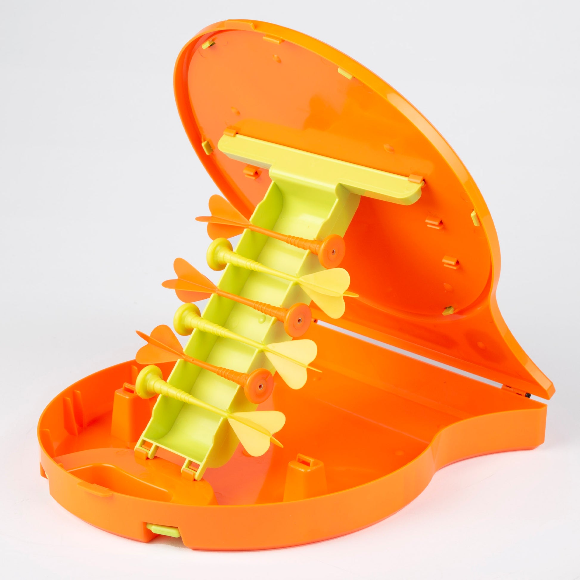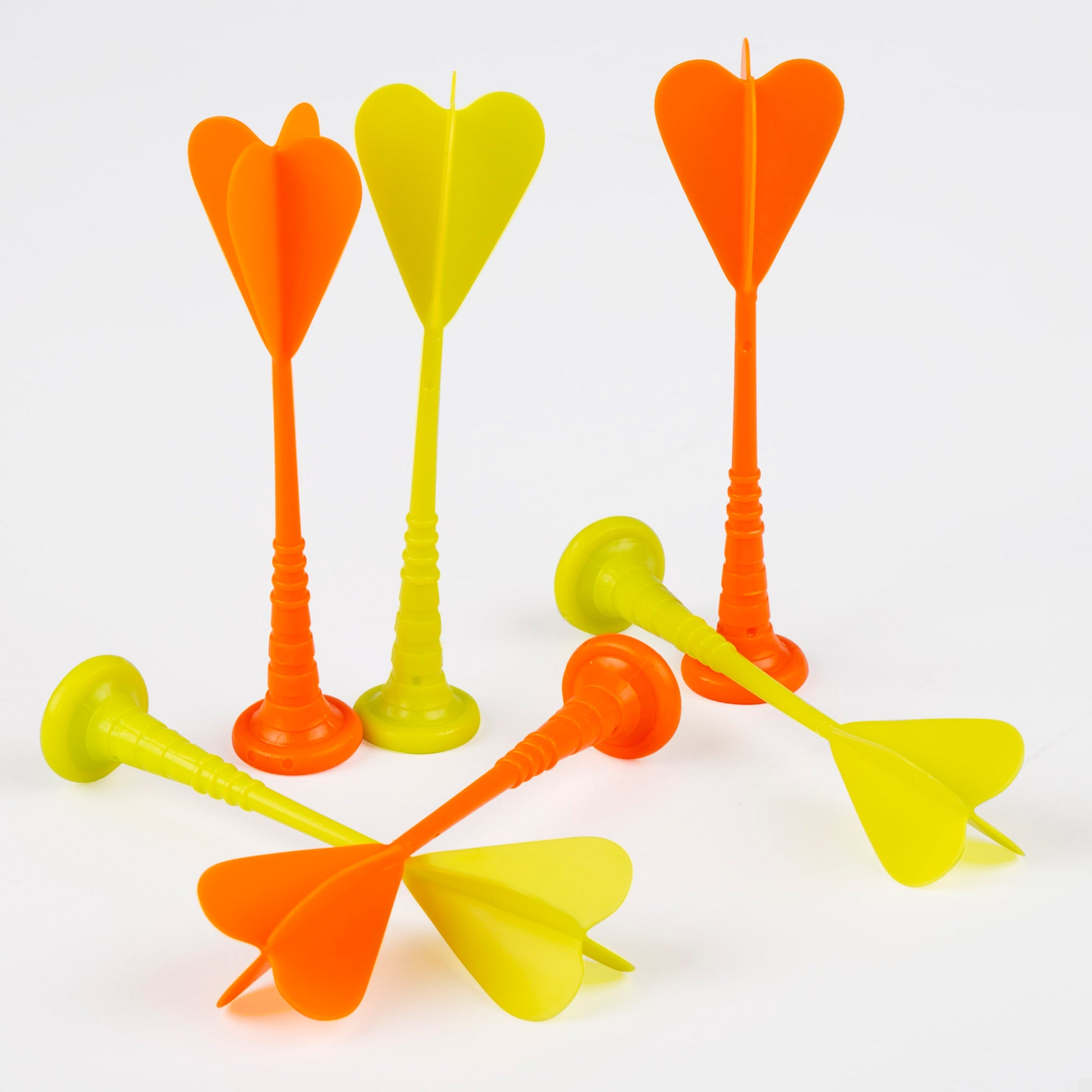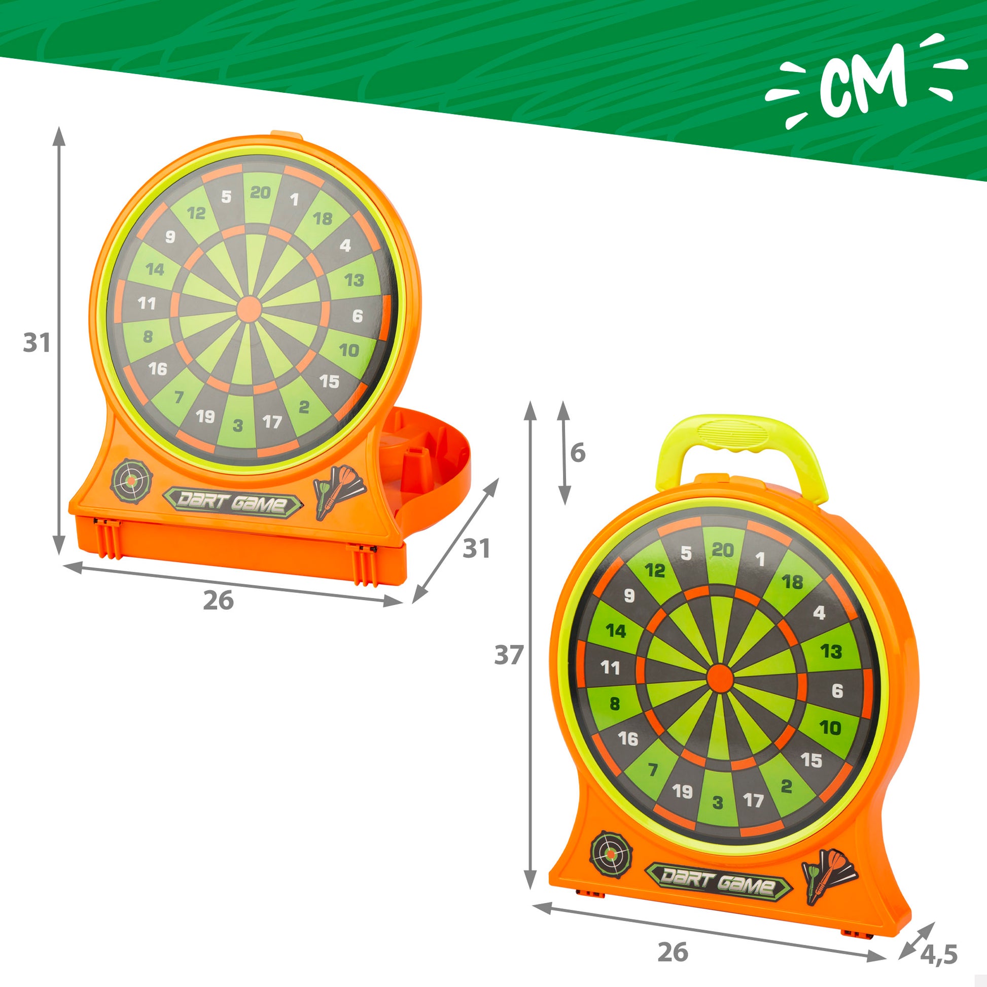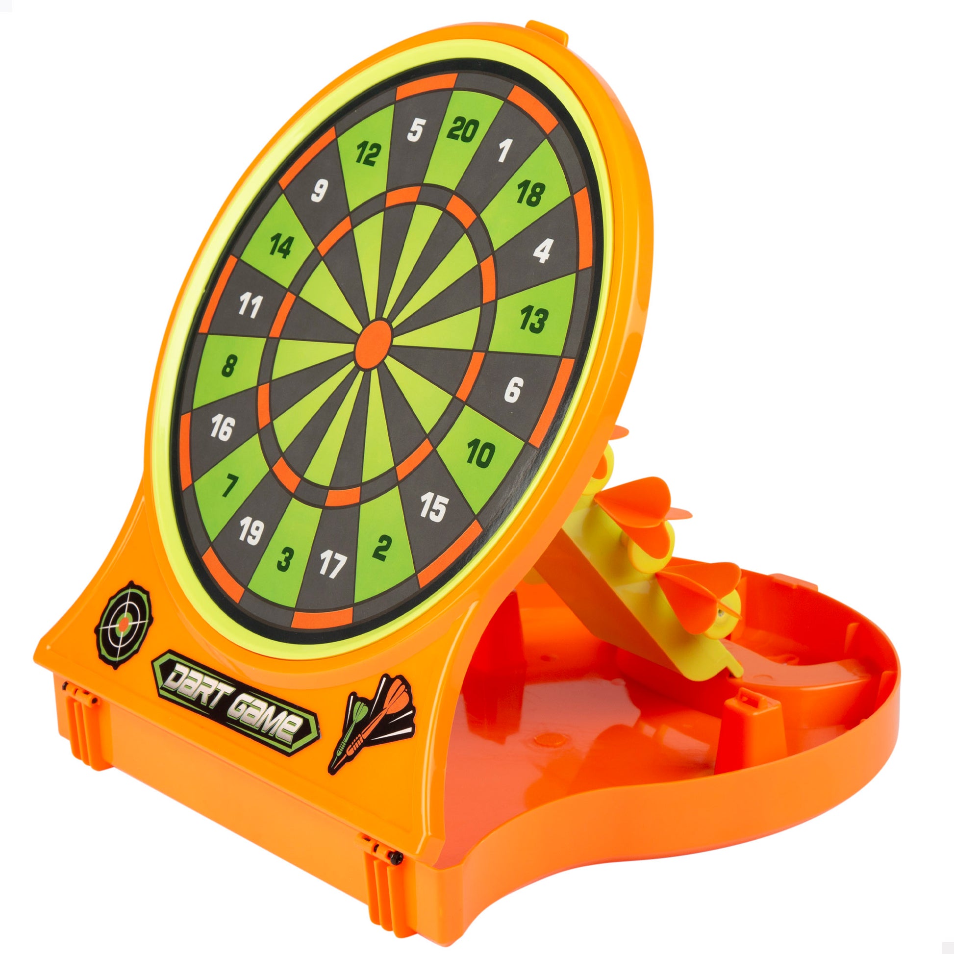 La diana incluye 6 dardos con puntas magnéticas que se adhieren con facilidad al tablero. Los dardos vienen en dos tonalidades distintas: tres en amarillo y tres en naranja.