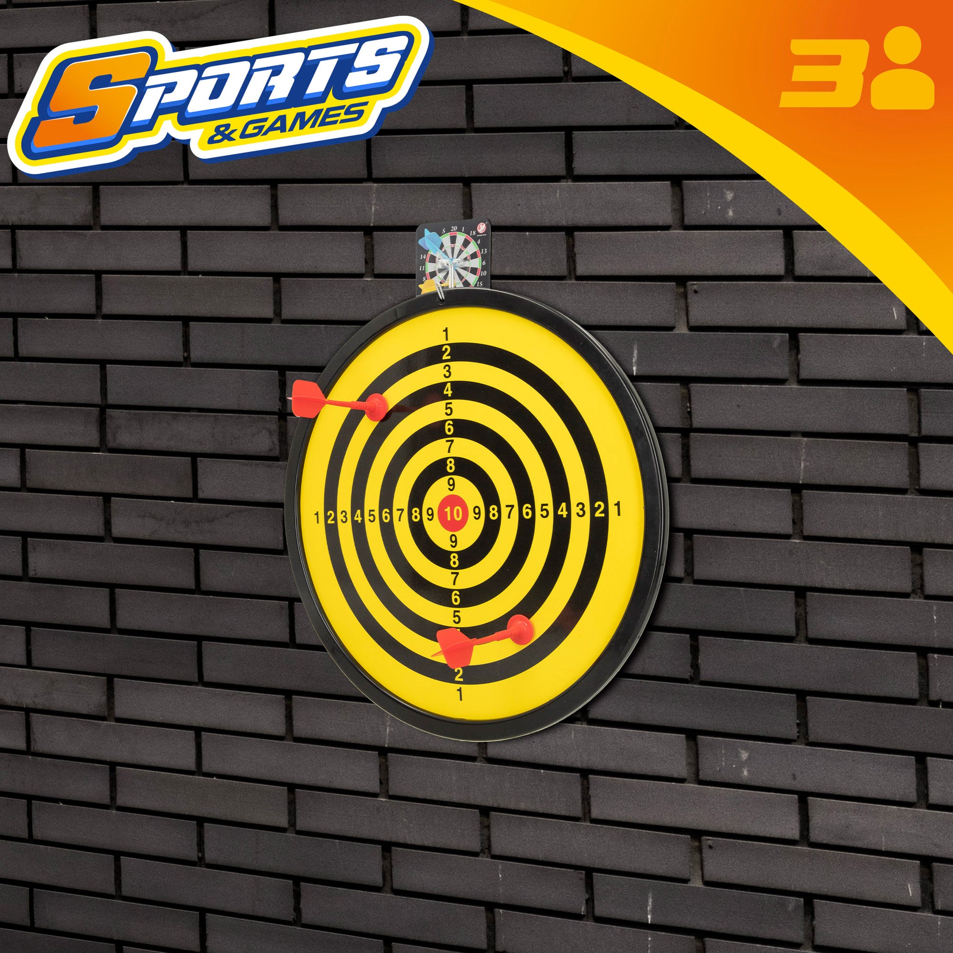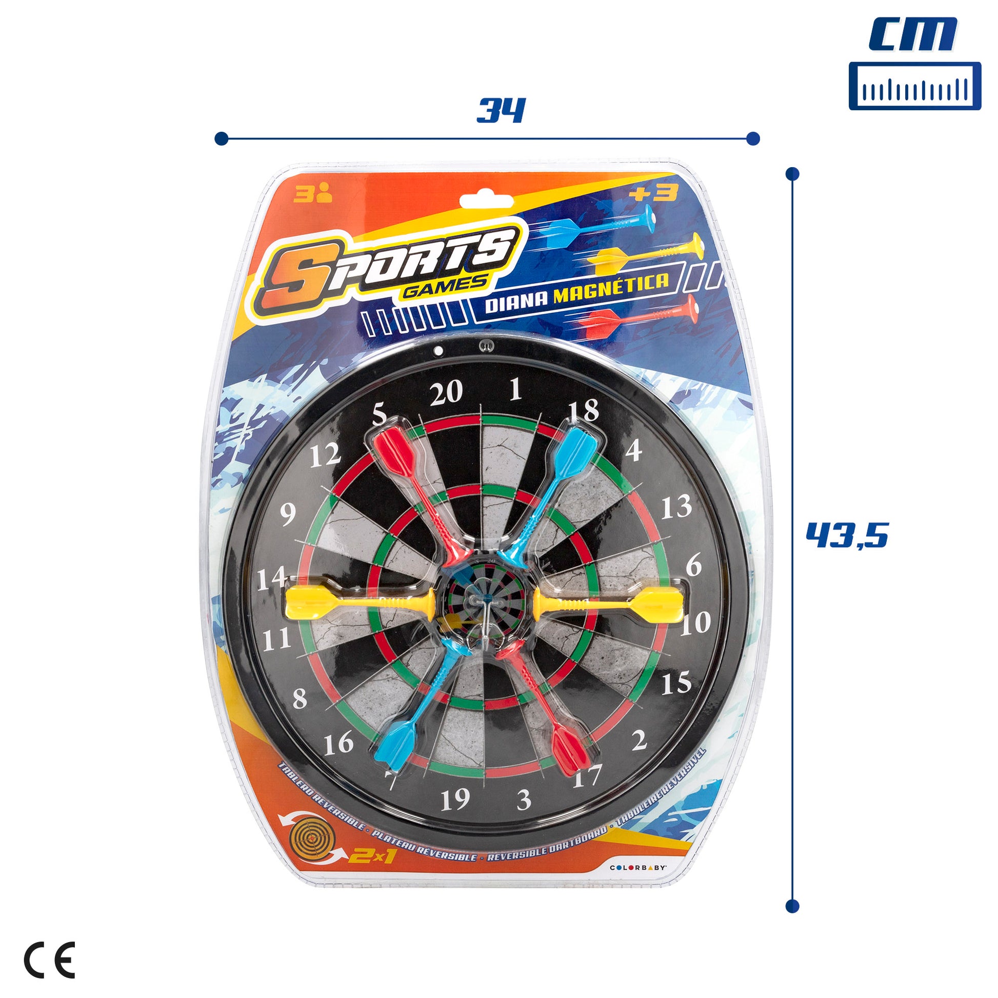 ¡Juega a los dardos siempre que te apetezca con esta diana magnética 2 en 1 CB Sports! Mide 30 cm de diámetro e incorpora agujero para instalarla fácilmente en cualquier pared tanto dentro como fuera de casa. Su tablero es reversible para mayor diversión: por una cara se puede jugar al clásico juego de dardos y, por la otra, a un juego de diana de estilo tiro con arco con dardos. Incluye 6 dardos (2 rojos, 2 azules y 2 amarillos) con punta magnética para garantizar la seguridad de los niños. Es perfecta para que intervengan 3 jugadores mayores de 3 años. Ideal para que los peques mejoren su concentración, coordinación ojo-mano y puntería. ¿Qué jugador conseguirá sumar más puntos?