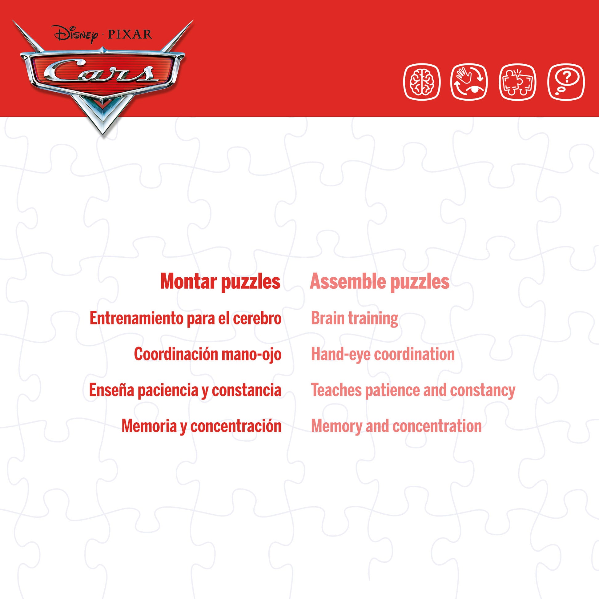 Como cualquier puzzle infantil, este puzzle Cars Disney, ejercita la memoria visual y fomenta la coordinación ojo-mano y el razonamiento, ya que los niños tendrán que pensar qué pieza va en cada lugar para tratar de encajarla correctamente. Si no encaja la pieza elegida, tendrán que volver a repetir el proceso con paciencia y constancia, fijándose muy bien en la forma de la pieza y en los colores y dibujos que presenta, hasta conseguir colocarla donde corresponda. Pero eso no es todo. Al tener un dibujo para colorear, este juego cars es perfecto para que los niños expresen su creatividad y desarrollen habilidades artísticas. ¡Podrán elegir los colores que quieran y hacer sus propias combinaciones!