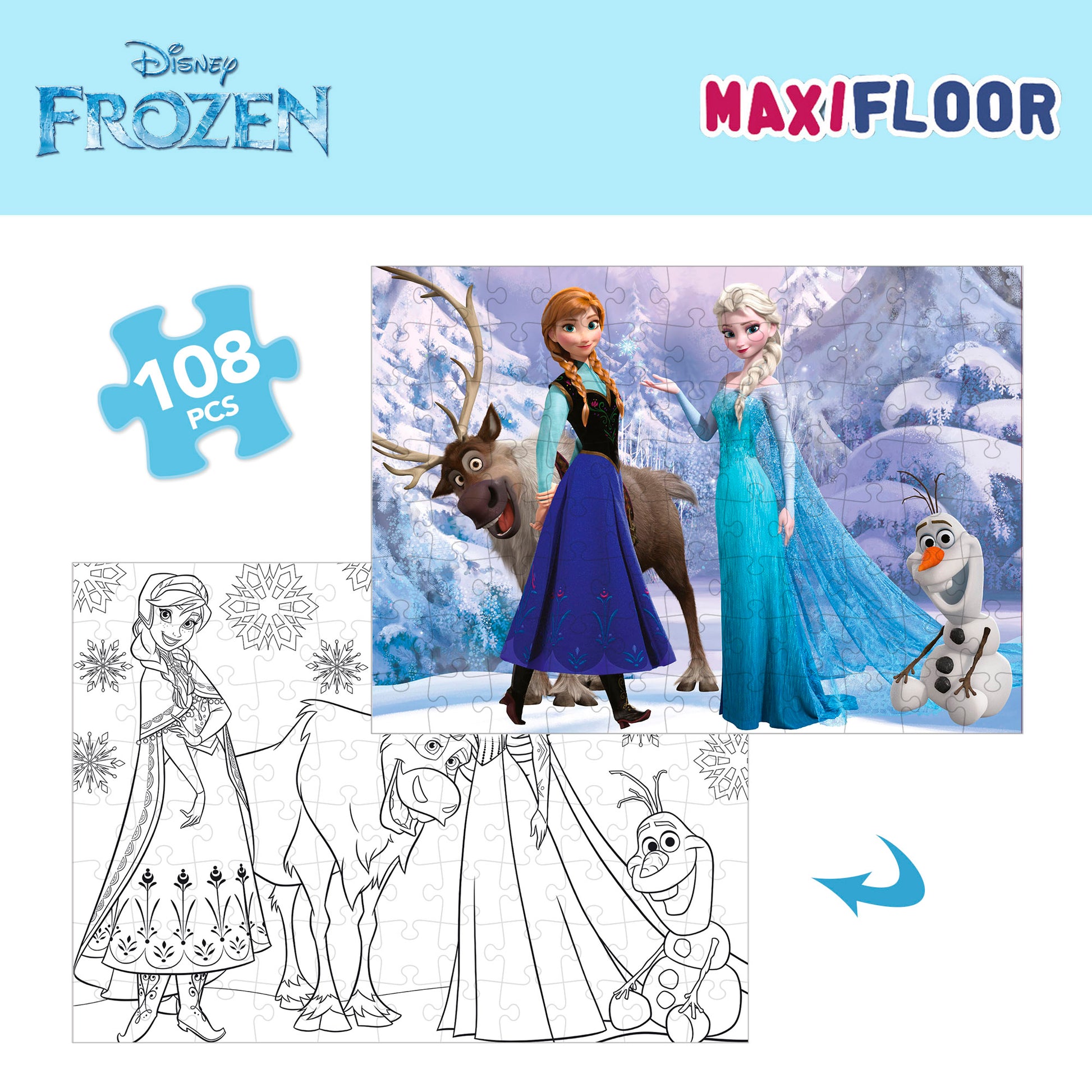El puzzle Frozen cuenta con 108 piezas con doble cara (una ya coloreada y otra en blanco y negro para colorear libremente).