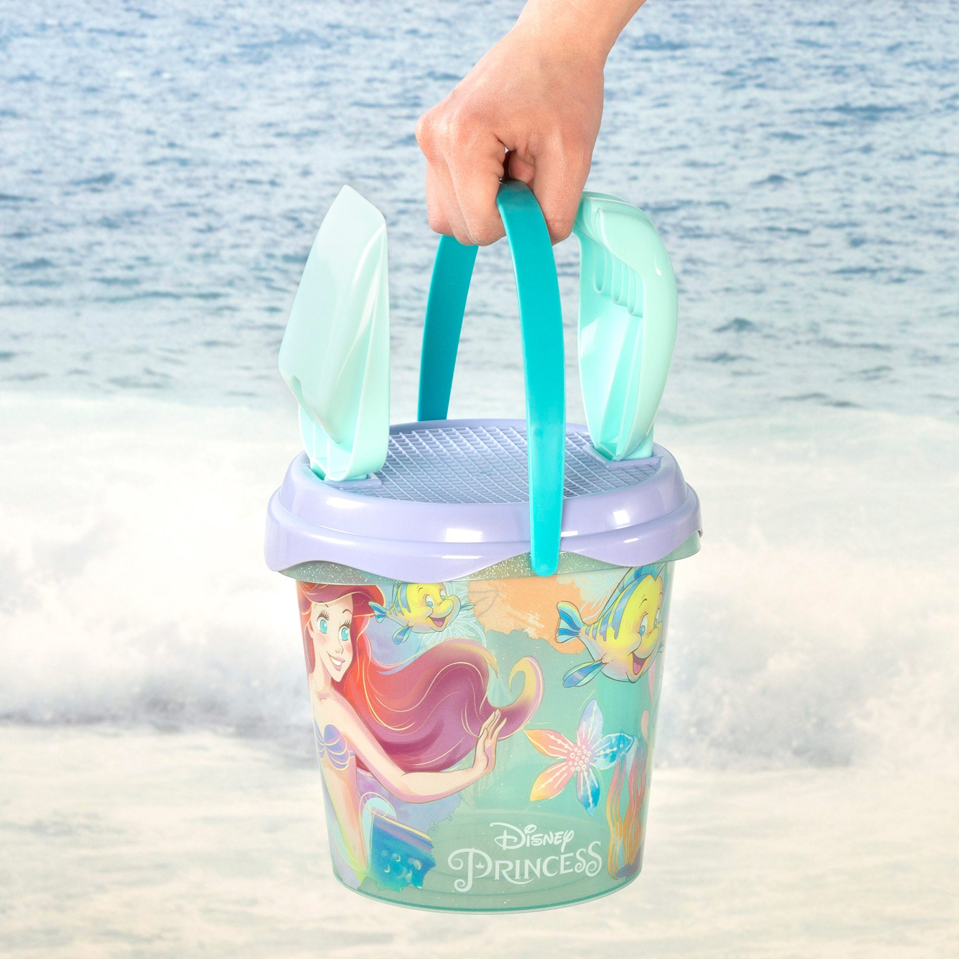 Incluye un cubo con ilustraciones de la Sirenita, una regadera, un rastrillo, una pala, un molde con forma de castillo y uno de corona. El cubo tiene asa para facilitar su transporte y una tapa colador con orificios para colocar la pala y el rastrillo. El set viene dentro de una mochila transparente para guardar y transportar todos los accesorios de forma cómoda y ordenada.