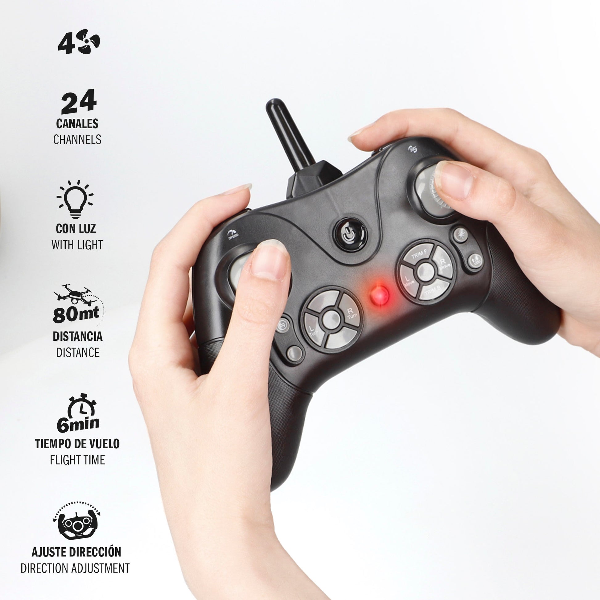 Este avión teledirigido niños viene con un mando remoto que opera a una frecuencia de 2.4 GHz y permite hacer giros 360º y moverlo en 6 direcciones: hacia adelante/atrás en dirección recta o hacia adelante/atrás girando a izquierda o a derecha, dentro de un radio de alcance de 80 metros y una autonomía de 6 minutos. Tiene 24 canales para evitar interferencias con otros dispositivos. El mando también facilita un despegue y aterrizaje automáticos, pudiendo volver al punto de inicio con solo pulsando un botón del mando. Incluye 4 hélices de repuesto y 1 mini destornillador. ¿A qué esperas para pilotarlo?