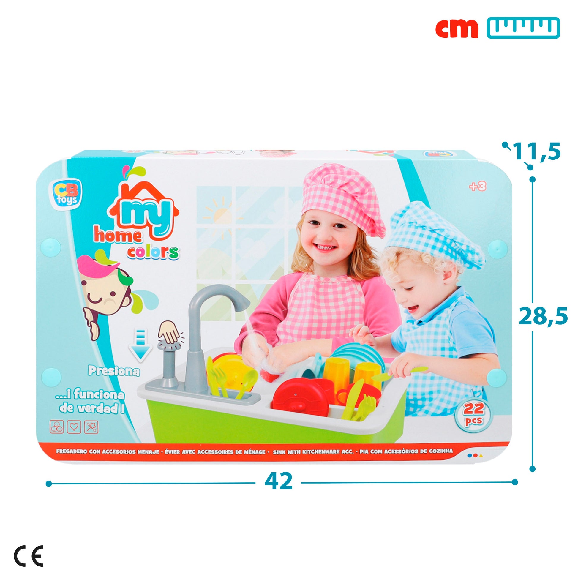 Con el fregadero My Home Colors los peques aprenden las tareas del hogar a la vez que juegan y se divierten. Con 22 accesorios de menaje de cocina que puedenlavar bajo el grifo porque ¡funciona de verdad! Tan solo hay que poner agua enla bandeja del fregadero y pulsar el botón para que bombee el agua. Recomendado a partir de 3 años. Fomenta la imaginación, el orden y la socialización.