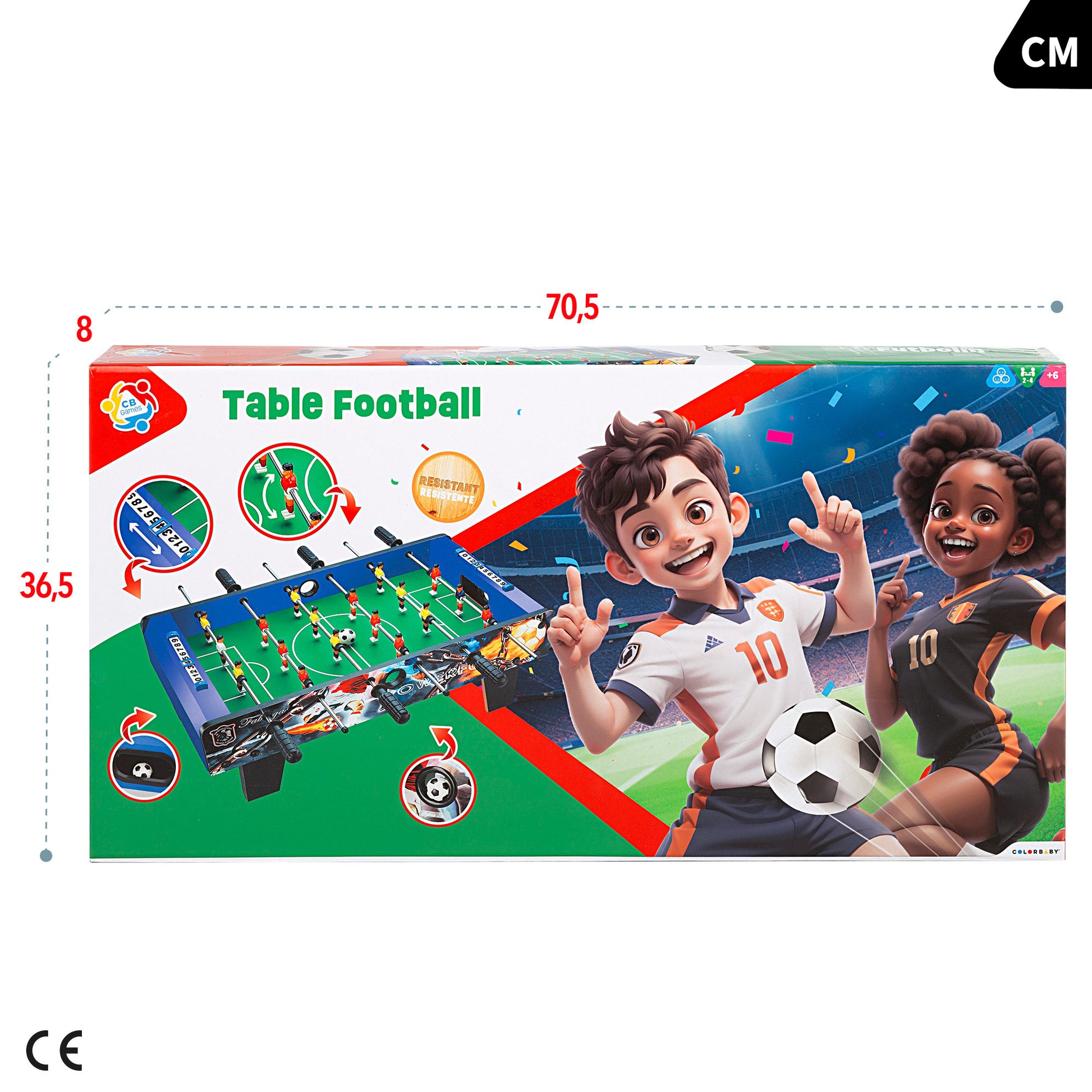 Disfruta de los mejores partidos de fútbol sin salir de tu casa con el Futbolín de madera CBtoys decorado con motivos futbolísticos.